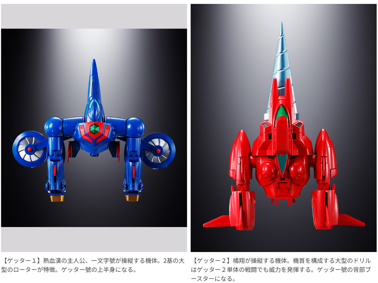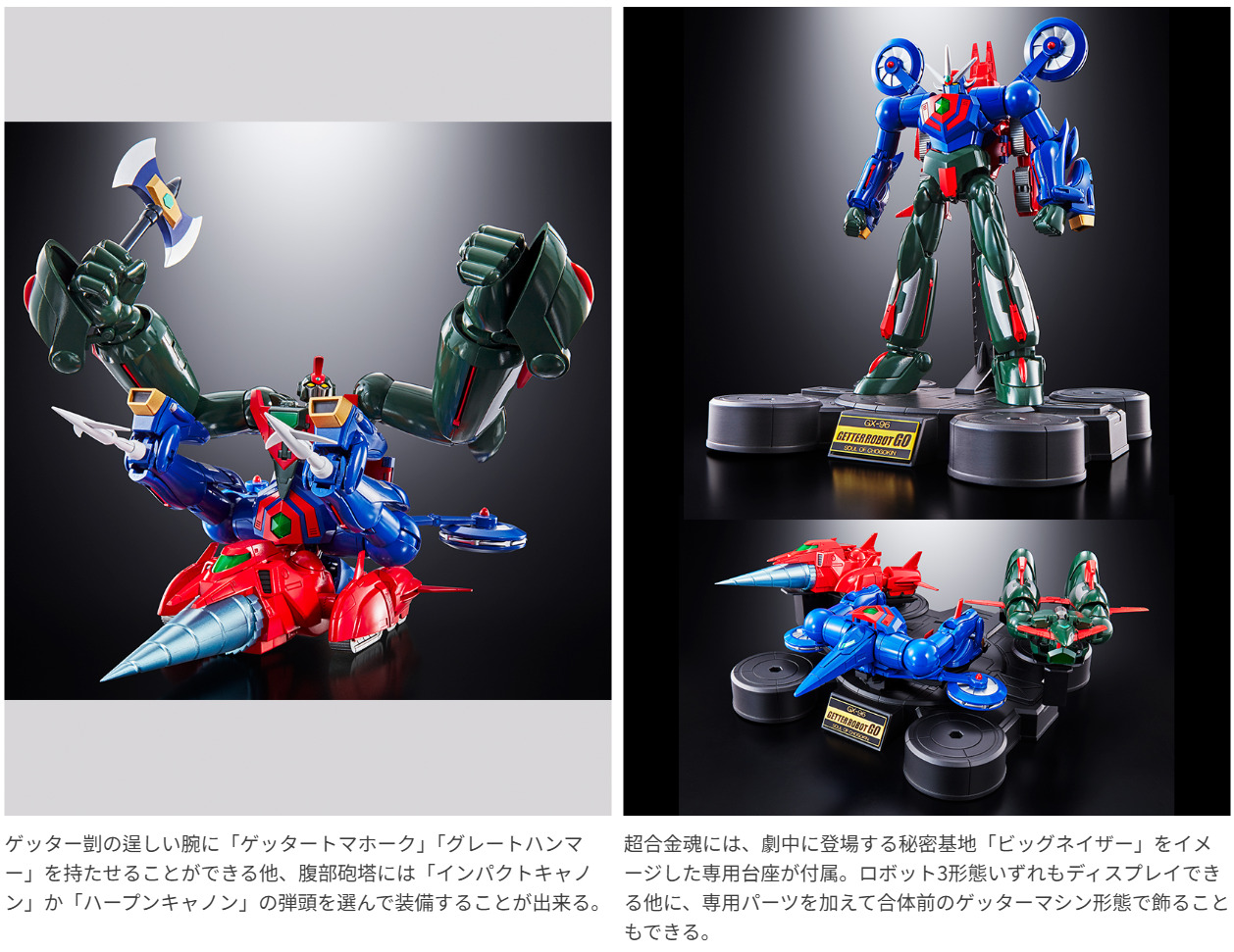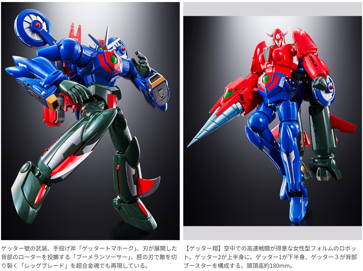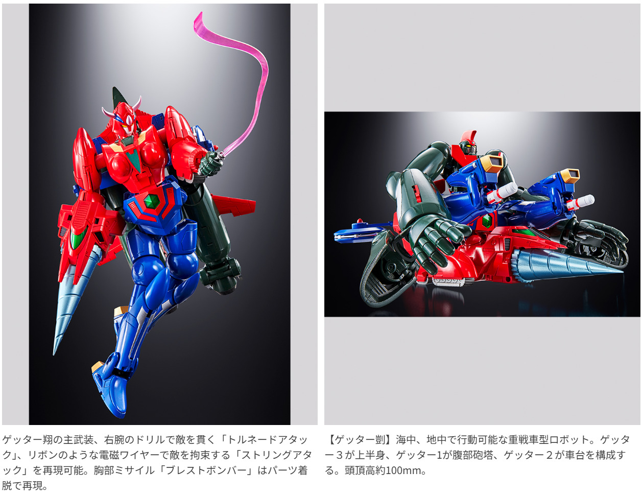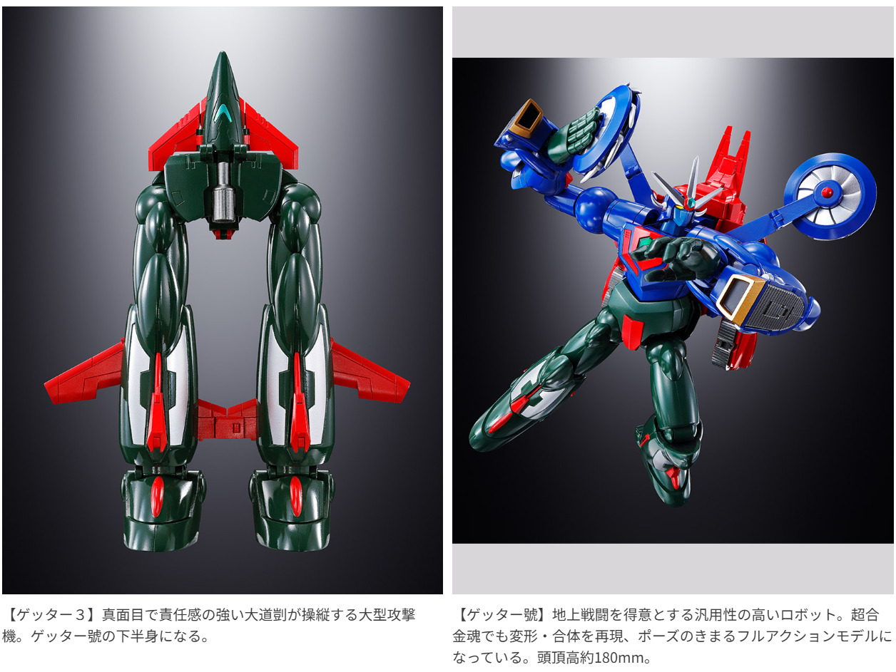 ゲッターロボシリーズのTVアニメ三作目として1991年に放送された『ゲッターロボ號』が超合金魂で登場。劇中同様に3機のマシンが「ゲッター號」「ゲッター翔」「ゲッター剴」に変形・合体する。