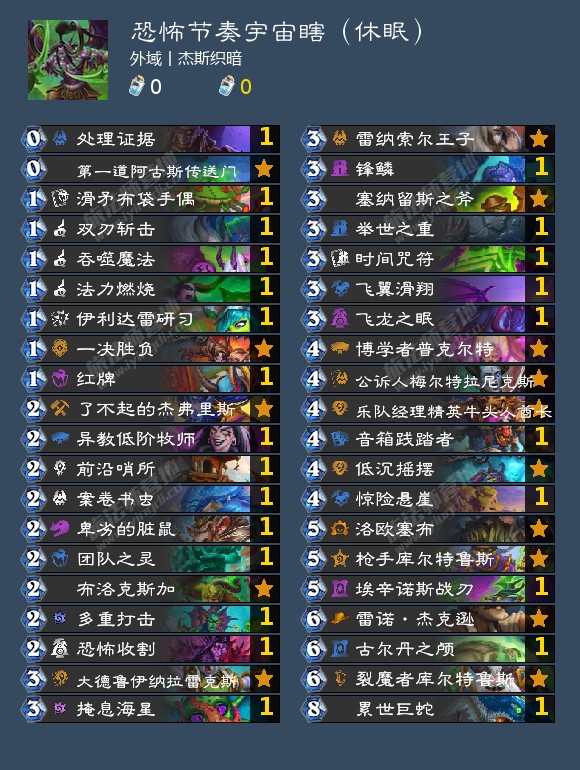 这是我的最终构筑,可以看到除了新卡,我还携带了一张3费3/3的大德鲁伊,我认为这张牌对宇宙瞎来说强度尚可,带大德的理由:本体是休眠,可以给蛇减费,并且梦境牌都不错,buff可以配合海盗地标,也可以配合牛里的赛丝诺,闷棍可以回手战吼怪,比如枪手,全场打5的aoe也可以处理一些瞎子难应付的场面,此外剩下的两个怪模型也说得过去,可以站场用还可以用红牌休眠大德继续刷梦境牌。新卡累世巨蛇算一个加强,以前宇宙瞎因为头也是六费的关系没法四费直接博学者排序,有了八费蛇的加入后四费排序,五费抽蛇,六费来头正好能打出去,理想节奏是一费任务,二费书虫,三费休眠,四费博,五费准时479进行场面压制,六费抽头触发流放以及一阶段任务,将五六费的牌进行大减费,下轮连拍狠狠压制。