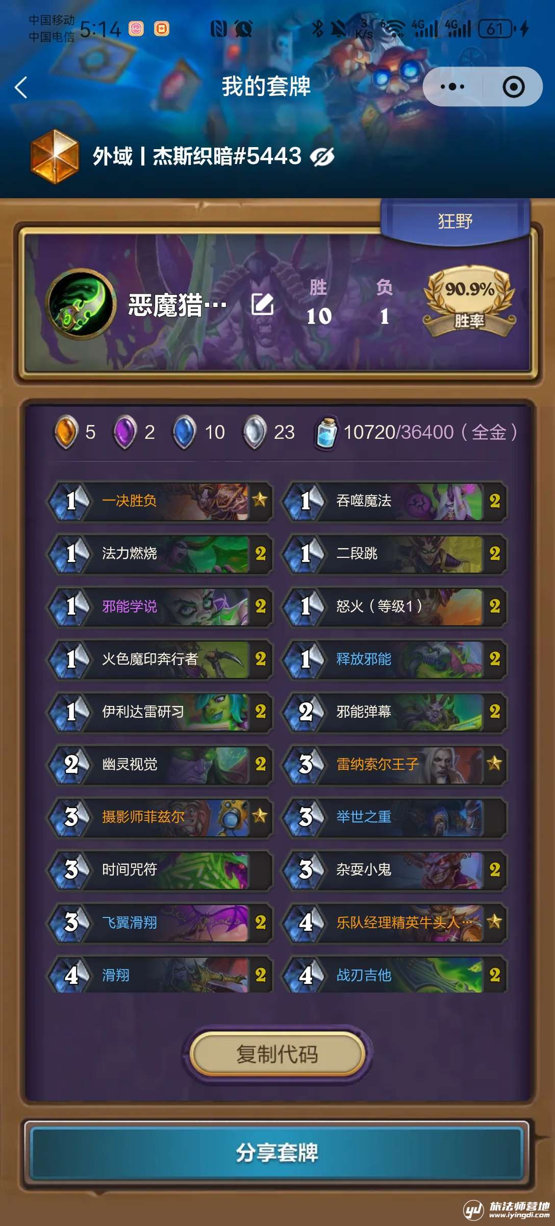 顺带发一下主播优化过的40邪能瞎,目前在月榜这种宇宙卡组比较多的环境强度还不赖,我很喜欢杰斯这张卡, 只有“我们”能承受烈火的考验,希望有更多dh玩家加入我们,外域欢迎每个喜欢dh的玩家,众志成城,钻研好玩又有强度的卡组,群号:971360025