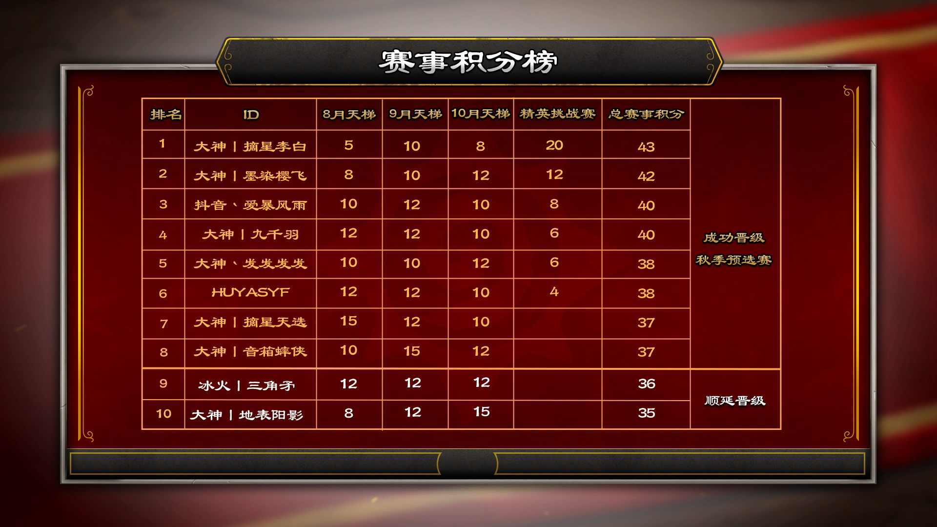 今晚官宣的秋季赛事积分榜和此前湮灭统计的一样。秋季精英赛全部结束后,李白也和横道世之介一样精英赛、积分赛道双重晋级。