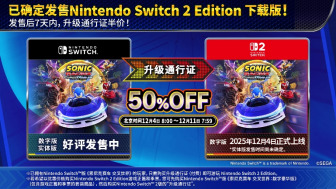 世嘉宣布,热销中的《索尼克赛车 交叉世界》将于2025年12月4日发售“Nintendo Switch™ 2 Edition”(下载版)。已经购买Nintendo Switch™版的玩家,仅需购买付费升级通行证即可游玩Nintendo Switch 2版。
