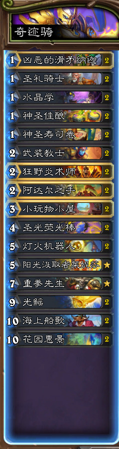 这套卡组最早成型于圣契版本之前,笔者当时用这套卡组打上了传说(自组卡组上传说还是很开心的),但随着圣契骑的出现,这套卡组的存在似乎再无必要。所以笔这并未将这套卡组上传到营地与大家分享(寄希望于后出的新卡能对原卡组有所补充)。