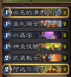 炎术士和荧光棒构成了我们这套牌的解场。作为节奏卡组,炎术士配合佳酿/寿司提供了堪比亵渎的解场能力,而荧光棒。。。这不应该是斩杀组件吗???(果然圣骑士职业斩杀是不存在的)