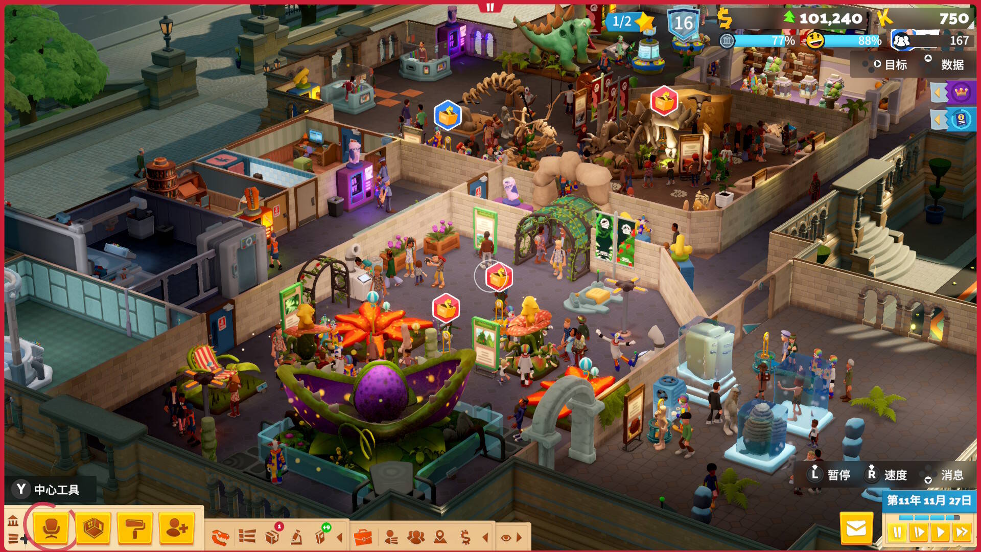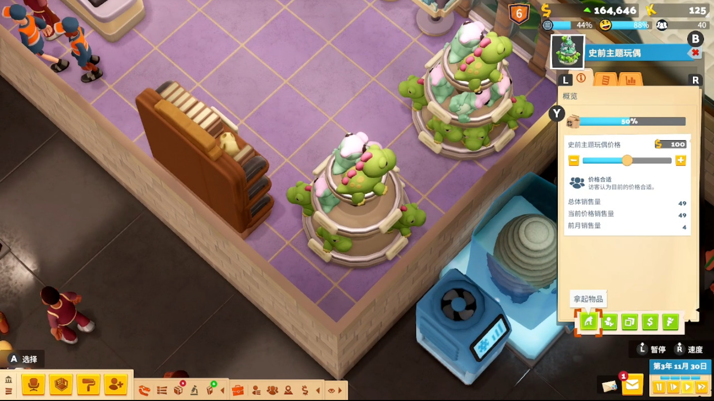 在建筑规划方面本作也是有了较大的自由空间,可以随意地建立隔墙来划分不同主主题的展厅,也细致地设计了普通隔墙和玻璃隔墙两种。通过设置导览线路可以串联起多个展品,此时不仅需要考虑展品的质量,线路的长度和流畅度也是需要综合考虑的标准。还有一些特殊的功能性建筑,使用单向门来规划来馆游客大致的行进路线,或是使用员工门来员工专用的工作区或是员工使用的捷径。在扩张时期招募了大量员工后,可以划分明确的区域来给员工分配特定的工作区域提高大家行动的效率,不过设置分区名称时还会有些bug导致稍有不便。