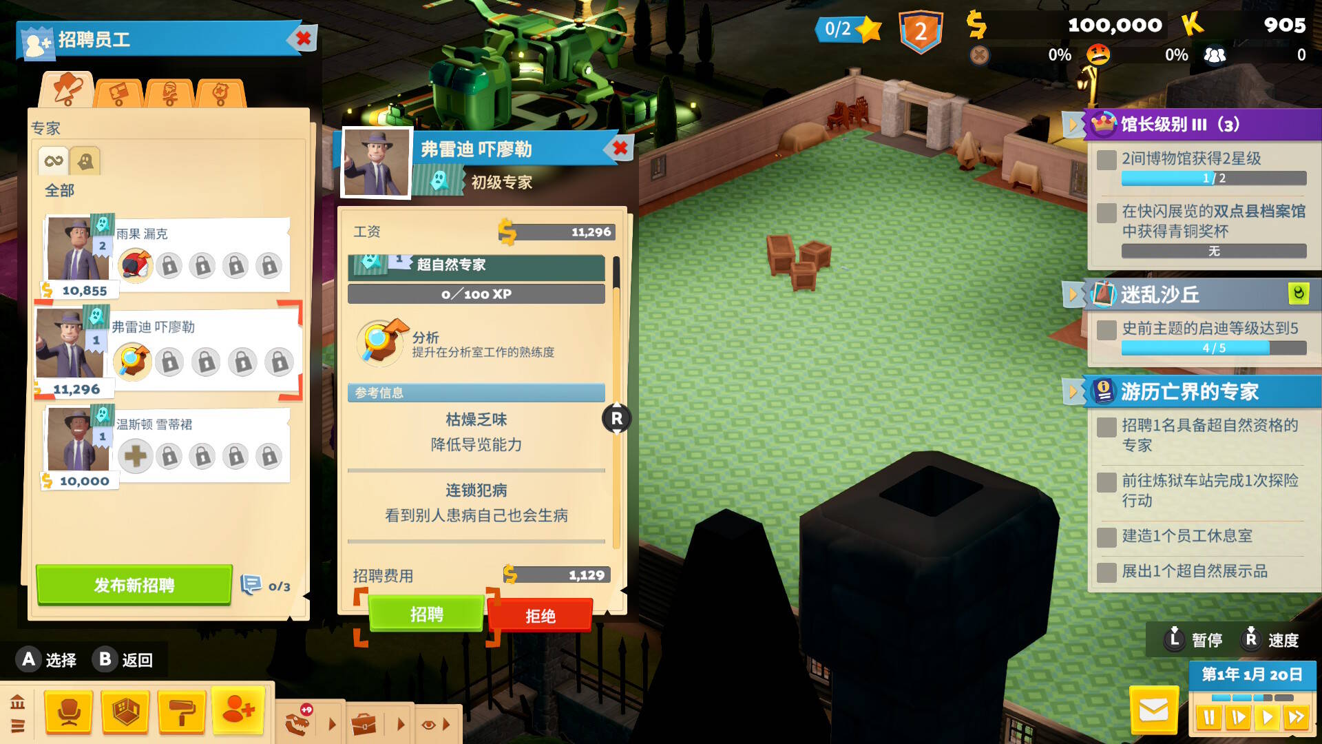 员工方面,首先是每个员工有一些随机的或正面或负面的特性,最搞笑的是我刷到过一个同时拥有【连锁犯病】-看到别人生病自己也会生病;【百毒不侵】-免疫所有疾病;两个特性的神人。另外每个员工还会有可以培训的技能,这些技能有些是会让他在馆内的工作效率提升,也有些是会在探险过程中提供帮助。较前作双点医院而言培训部分是做了一定的简化,只需要建立培训相关的房间和设备就可以给培训所有技能。