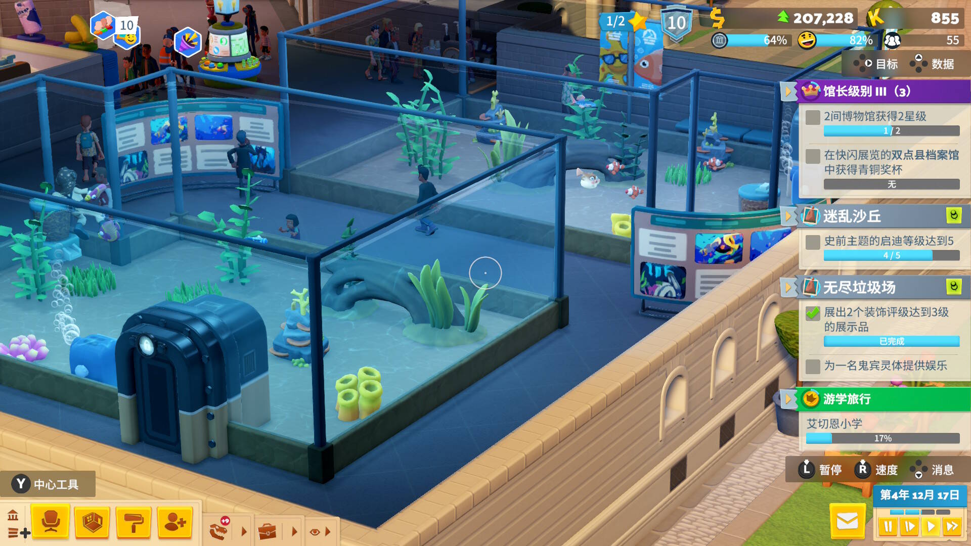 UI设计相比双点医院更加清晰,任务导览也可以分类自由地折叠。不过能看得出来很多操作还是在PC端会更加友好,家用机平台刚开始游戏时可能很难流畅地找到各个界面。得益于NS2的机能,本作的画质和流畅度相比NS1代的双点医院也都有了非常大的提升,但尽管如此在博物馆发展起来,展品和客流量都变大之后在特定情况下依然会有些许的卡顿,且地图切换时的加载时间也显得比较长。