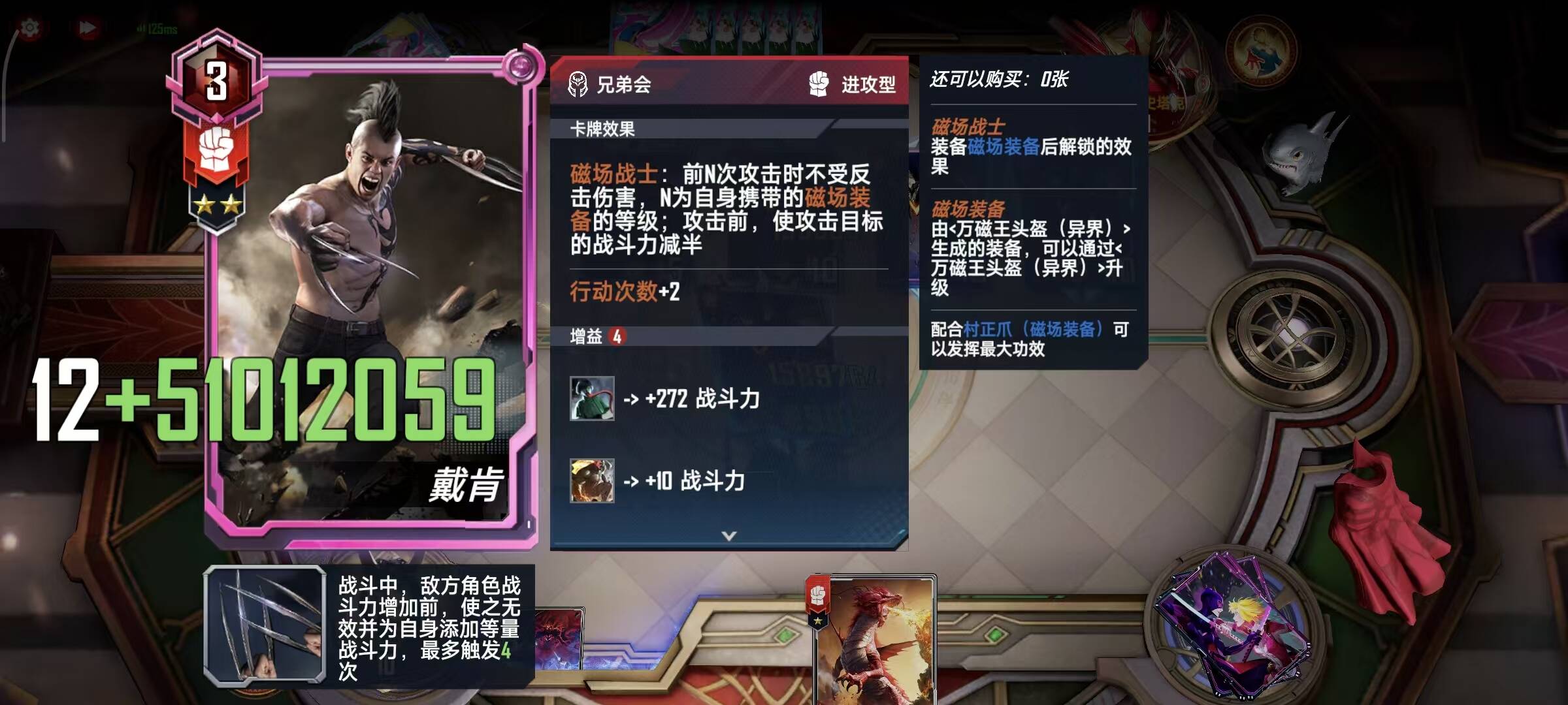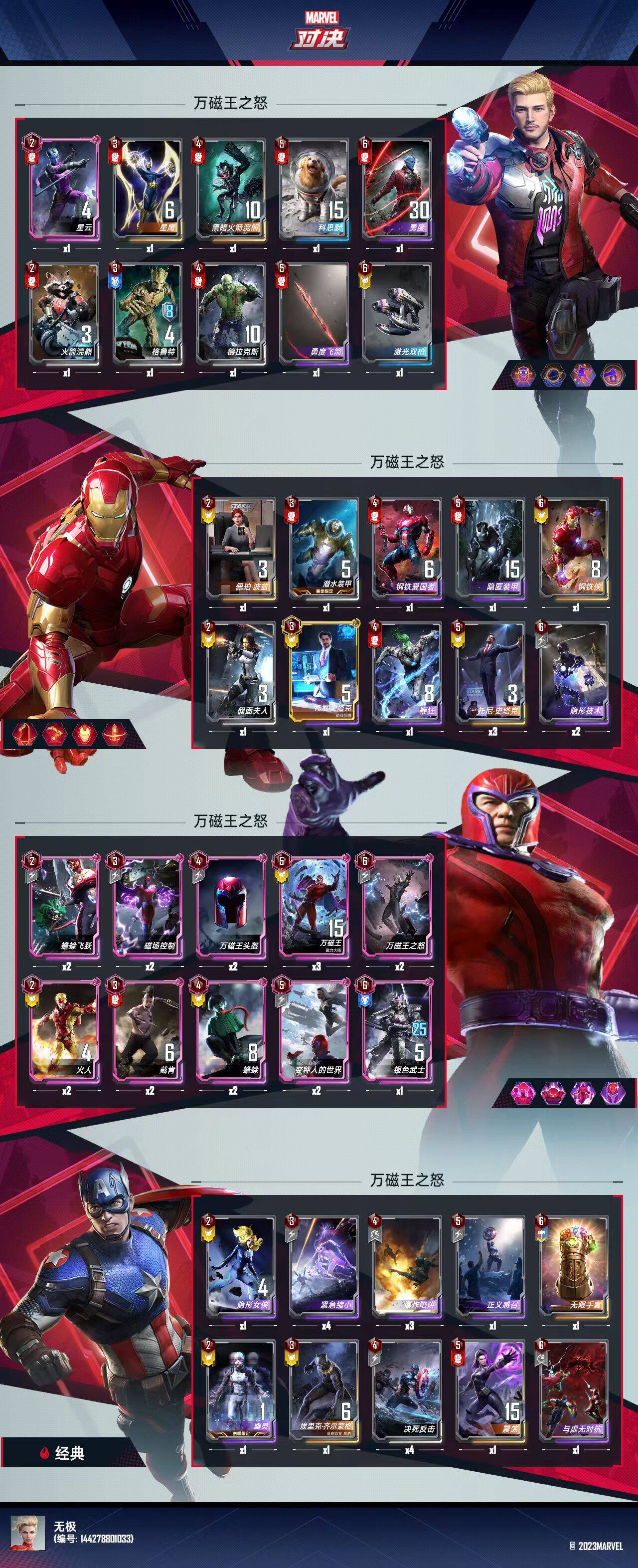 由于我是新号没有什么针对卡(经典包运气不行),我说说我的理解:赏金二费都可以带,胡的话赏金经济后期真的起飞,我是没有异界亚当用小浣熊单链过度,星爵六费针对卡真的重要,如高歌,好多把如果有这卡拿先手我都不会第二;我认为钢铁侠的夜巡很重要,磁场战士只有五个人,适配夜巡(我托尼还没四张就别指望我有夜巡了),隐形就更不用多说了;磁场战士我认为除了万磁王和银色武士外全俩张就够了,下限已经有了,全卡上限肯定更高;火人+蟾蜍飞跃前三回合配个守护角色大多数情况能稳血(浪不行),磁场战士前中期最核心的就是蟾蜍,有了蟾蜍戴肯且都有装备后,除非对面全百战力,不然六回合内基本稳了,如果这时期能遇见奥创绝境链接可以刷一波大身材了;装备升级也没啥公式,不胡的时候勉强都带个一级,胡的时候,头盔不缺,唯一的小知识是一星火人我们先给他带上头盔(1级),触发火人技能获得一宝石,商店买一张火人合成二星火人,然后再给他使用万磁王头盔他变成二级装备且触发技能获得二宝石(使用其他事件或者给别人带头盔获得1宝石)。