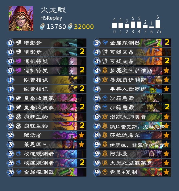 新版本火龙贼的改进点体现在橙卡【半兽人迦罗娜】的加入,其战吼成功触发后可以大幅压低对手血量,从而制造更多的斩杀机会。当然难以被反制的【秘迹观测者】以及抢节奏的【沙箱恶霸】都是这套卡组的优质组件,可以在中期给对手极大的干扰与压力。