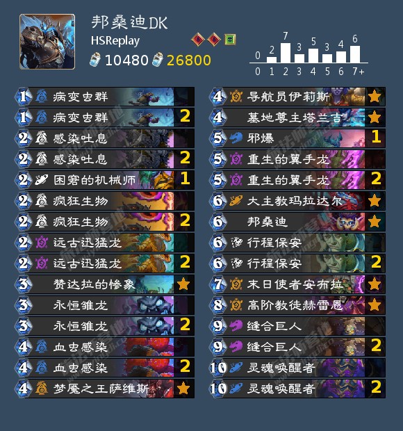 【邦桑迪】是这套牌的抗快攻核心。依靠恩泽带来的随从永久性的突袭、嘲讽、吸血,使得DK可以较为顺利地将对局拖到中后期,凭借优质的亡语随从、0费的【缝合巨人】的压场以及【末日使者安布拉】等随从的一波铺场,从而平推对面。