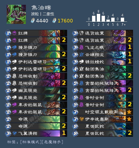休眠+巨蛇,焦油赖场,古树过牌,命源减费,戴欧斯+翔龙复制迪奥斯(或者提前复制迪奥斯,注意不要复制到焦油)+迪奥斯*2+最后下古树,10费4个或者5个格子100斩杀