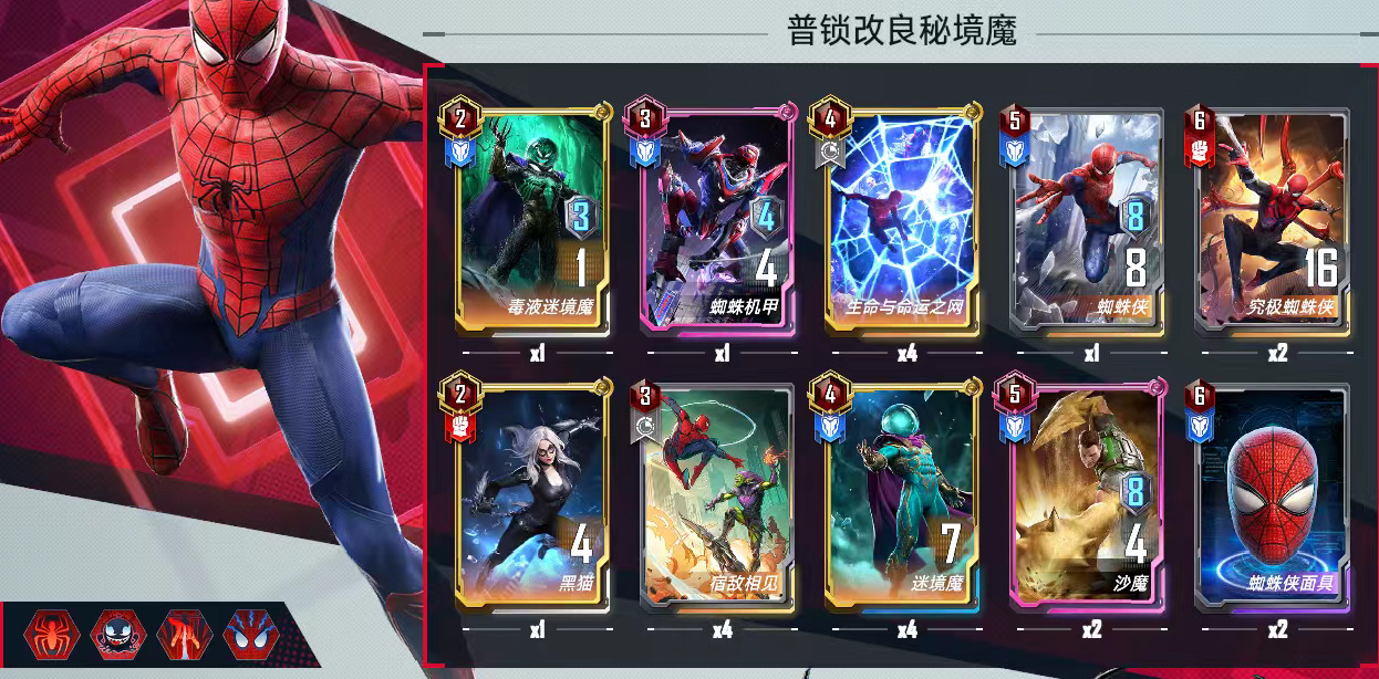 6费:究极蜘蛛侠(防清场),蜘蛛侠面(具有亡语效果的蓝卡都可以用)