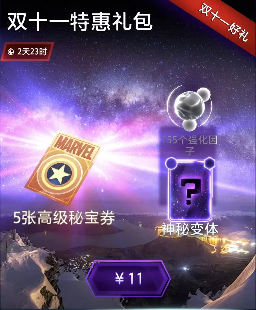 终极羊毛月!超值礼包第三弹来袭! 仅需11元,即可获得【5张高级秘宝券】+【155个强化因子】+【1个神秘变体】! 11月11日 - 11月13日,游戏内限时售卖。 近期对礼包有需求的探员,可以优先考虑本次的双十一特供礼包哦~ 感兴趣的探员请前往游戏内查看详情,最终内容请以游戏内实际为准。 最后,铁盒温馨提示:礼包虽好,还请大家理性按需购买哦!