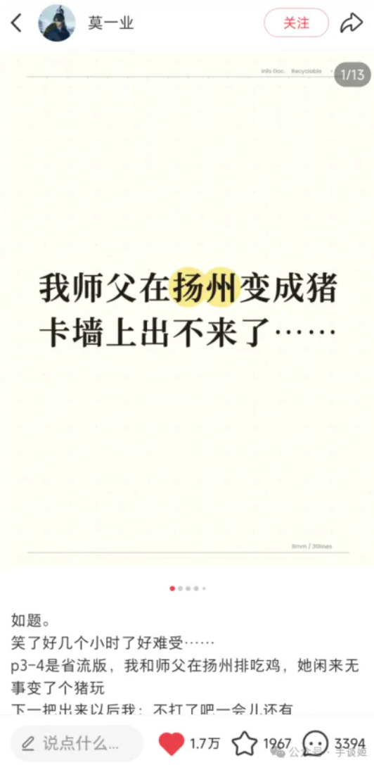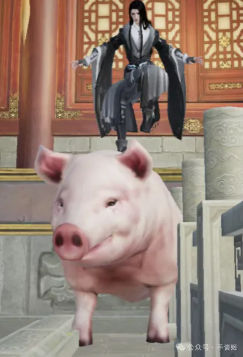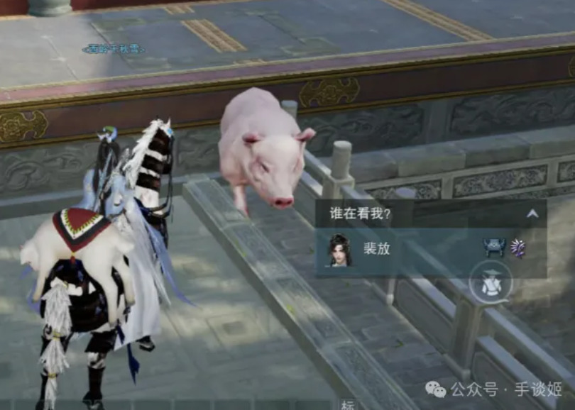 虽然让自己精心捏脸打扮的帅哥美女骑猪怎么看都OOC,但这确实是《剑网三》玩家游戏里会干的事,有时候拍吃鸡或者排本无聊就骑个猪玩,不过小红书用户“莫一页”表示,在和自己的浩气盟花哥师父“裴放”排吃鸡时,裴放无聊便拿出训猪宝典在扬州城骑猪玩,骑着骑着排进去了,再出来的时候,莫一页就找不到自己的美丽花哥师父了,只有一只猪无辜待在墙角。