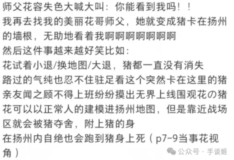 后来官方默默地修好了这个BUG,猪从扬州城消失了,花哥也重新夺回了身体的掌控权,一切归于平静……吗?