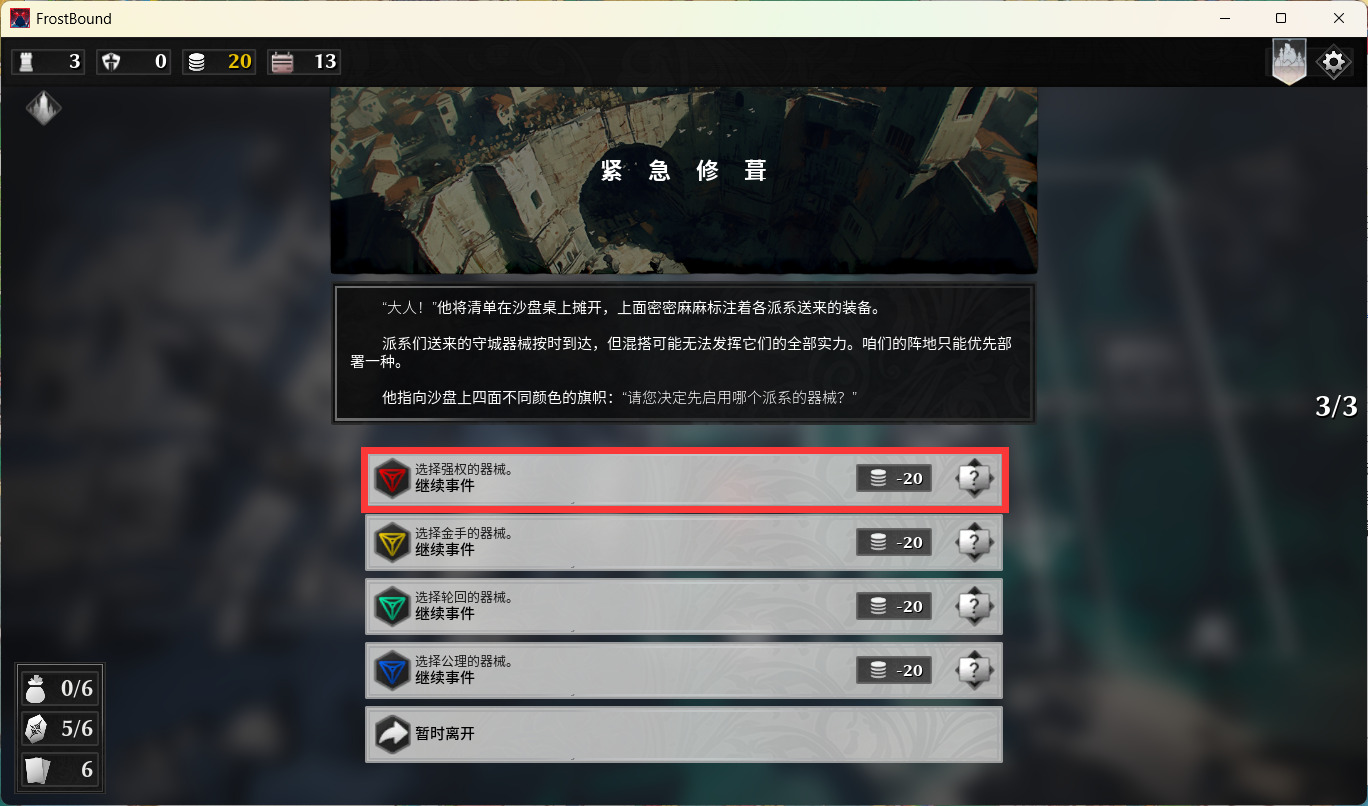 需要注意的是,启动只需要海伦妮+出纳就能达成。13天这里的敌人不用打,物资全用来选牌加速build成型。神秘事件(中间列)里可能会刷个免费的卡牌征选。还有一个紧急修葺事件在右侧列,选强权然后部署在第3列(后面可能会刷一个对面遍地小怪的战斗,挡住能不让己方自带的场地给小怪全反击死,能多刷点金币)。