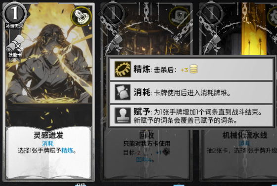 灵感迸发是我感觉最容易获取的让海伦妮获取精炼词条的牌了,当然会有事件也能给海伦妮增加这个词条。但是实际在局内牌上附加词条只能有一个,经常会和更好的词条冲突,但是不关键。