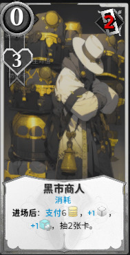 黑市商人:0补给需求,本回合+1补给,下回合再+1补给,抽2。稀有度:稀有。无需多言,后期有多少拿多少。