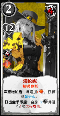 海伦妮在打出金手币后会进行远程攻击,金手币效果也会进行一次攻击,也就是说每次对海伦妮施放金手币其会增加2远程伤害并远程攻击两次,且游戏机制精锐词条击杀后增加声望,海伦妮在增加声望后会获得金手币,且同时因为刚毅词条会随声望增加而增加在场时间,所以不必担心离场问题。(我们海伦妮真是太全面辣!)也就是说只要通过特定卡牌产出大量金手币,让海伦妮快速发育,最后海伦妮自身达成击杀─获得金手币─击杀循环。