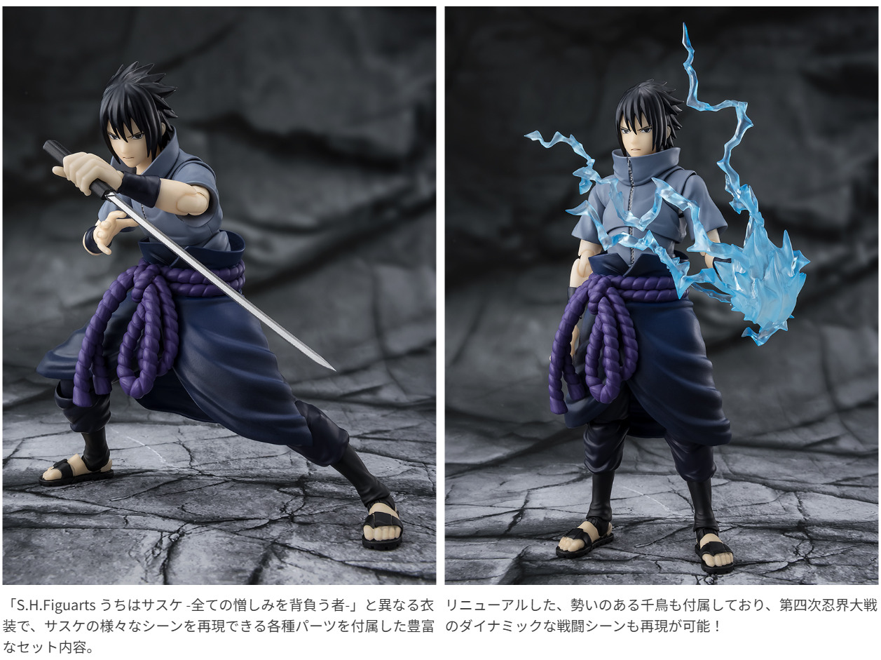 S.H.Figuarts『NARUTO-ナルト-』シリーズから、「うずまきナルト」に続き、「うちはサスケ」が登場!衣装は過去商品と変わり、チャックを閉めた衣装で、第四次忍界大戦の様々なシーンを再現することが可能。ナルト同様、左手の陰の印も細かく造形。刀や千鳥が付属する他、新しく刀の周りに千鳥をまとう千鳥刀パーツも付属しており、ダイナミックな戦闘シーンが再現できる。