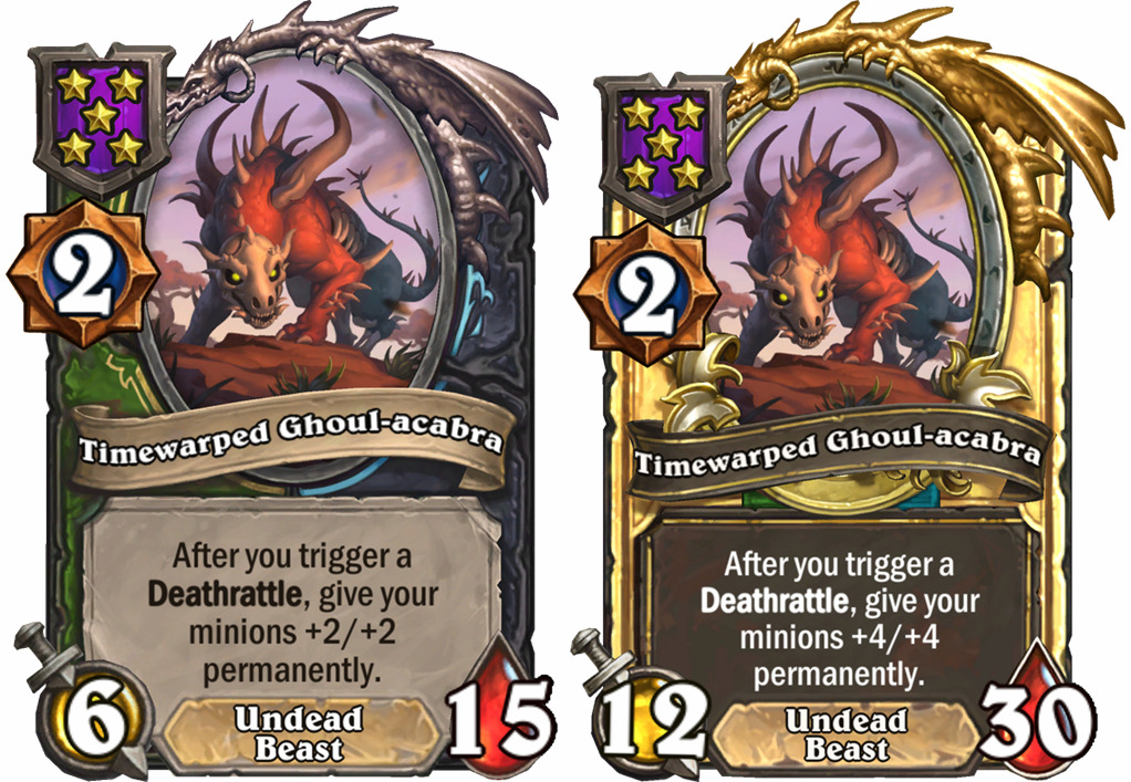 - [2费6/15亡灵+野兽] 在你触发一个亡语后,使你的随从永久获得+2/+2。