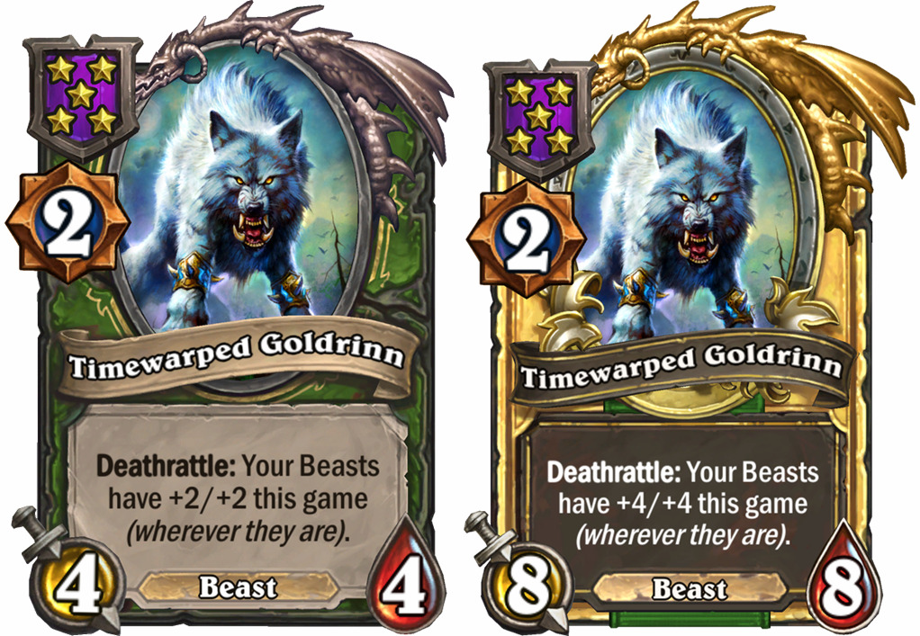 - [2费4/4野兽] 亡语:在本局对战中,你的野兽拥有+2/+2(无论它们在哪)。