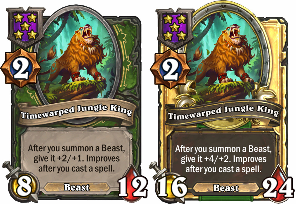 - [2费8/12野兽] 在你召唤一只野兽后,使其获得+2/+1。在你施放一个法术后提升。