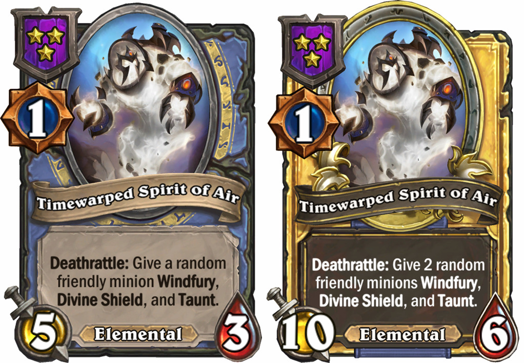 - [1费5/3元素] 亡语:随机使一个友方随从获得风怒,圣盾和嘲讽。