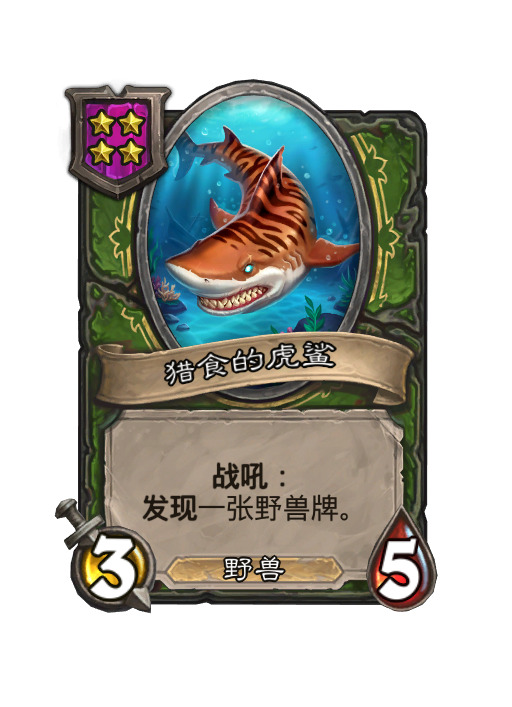 虎鲨的出现让野兽终于也有了经济,可以配合铜须小转一下了。这种战吼+发现特定种族的最赚经济的设计一般不轻易出,要有也得高本了,但考虑到野兽实在不怎么转得起来,这张牌强点也就强点了。