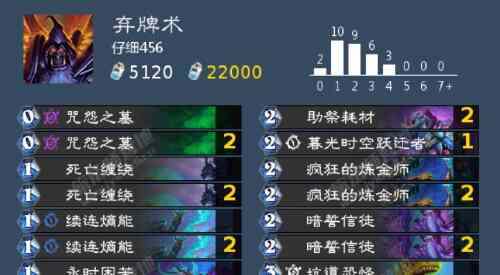 首先是任务瞎,体感是大劣,法力燃烧对这套卡组的限制太大了,四费前一张法力燃烧几乎等于开门,什么都做不了。四费以后大部分瞎子都基本上可以展开了,我们的弹幕没办法处理瞎子一地的6-7或7-8。哪怕前期节奏很顺,二费准时专卖商也会被沉默,失去后劲。打任务瞎有一种无力感,只能靠场面取胜,buff场面的随从将对面打至低血靠法术斩杀。因此咒怨之墓 可以起手就开找站场随从。