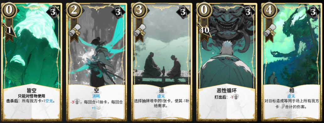 - 觉思:对1列卡牌使用,目标+3空无。攻击卡、防御卡、技能卡各有一张可以给一列卡牌加空无效果。