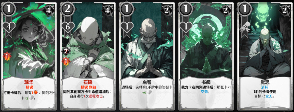 - 琼华:打出卡牌后,每有1点声望,同列2张卡+2血量。给同列伙伴增加血量的精锐卡。