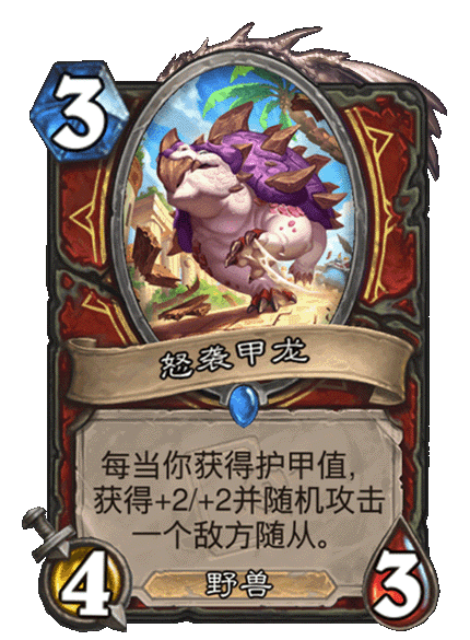 自己开发的冷门套路——甲龙战。怒袭甲龙的效果是:每当你获得护甲值,获得+2/+2并随机攻击一个敌方随从。