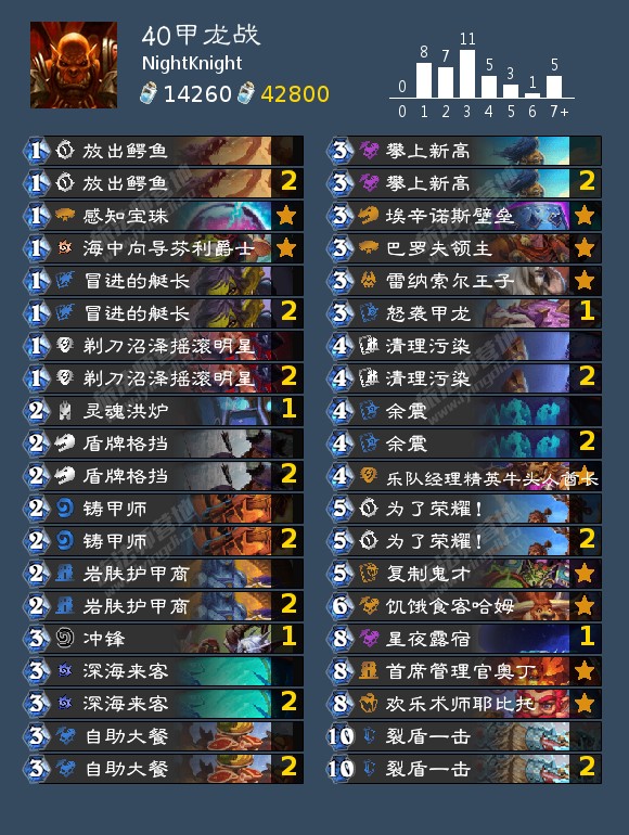 4.含复制鬼才微缩,上甲龙:①甲龙+②复制鬼才微缩+③铸甲师+④艇长+⑤野猪人——共计11费(攀上新高加费HH!)