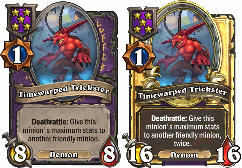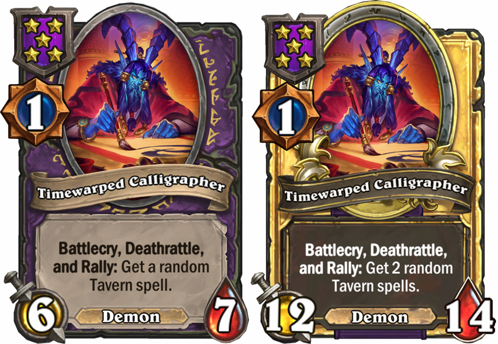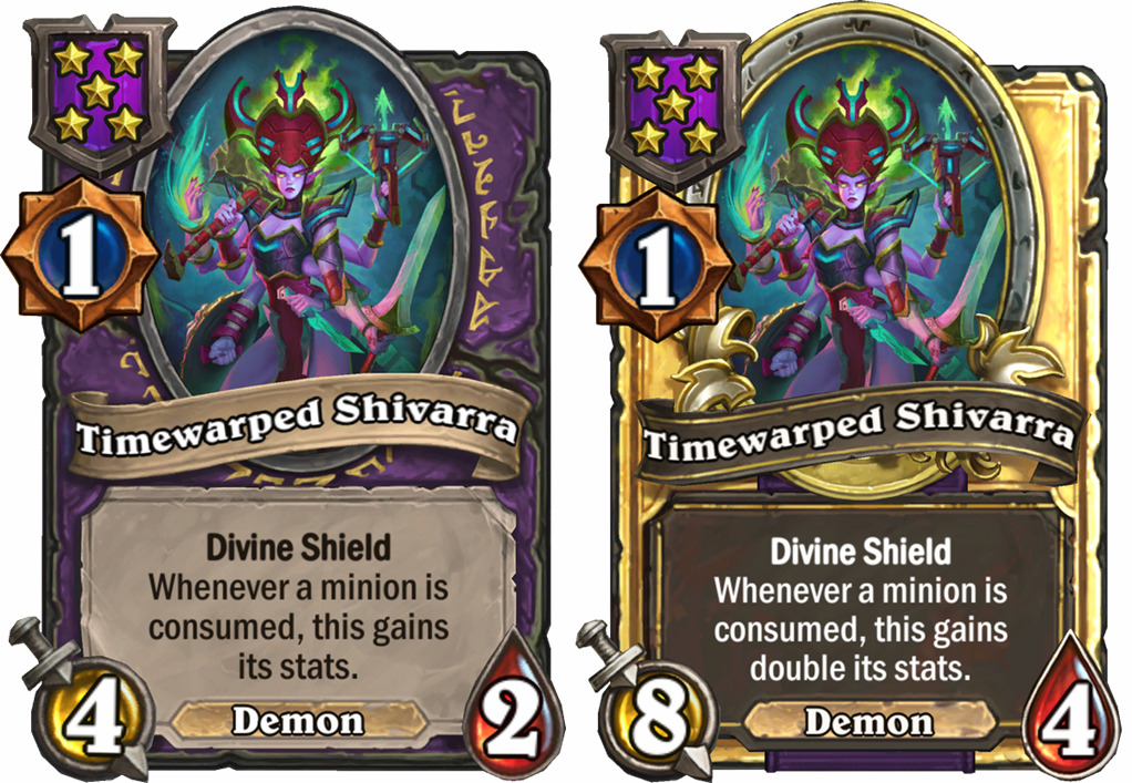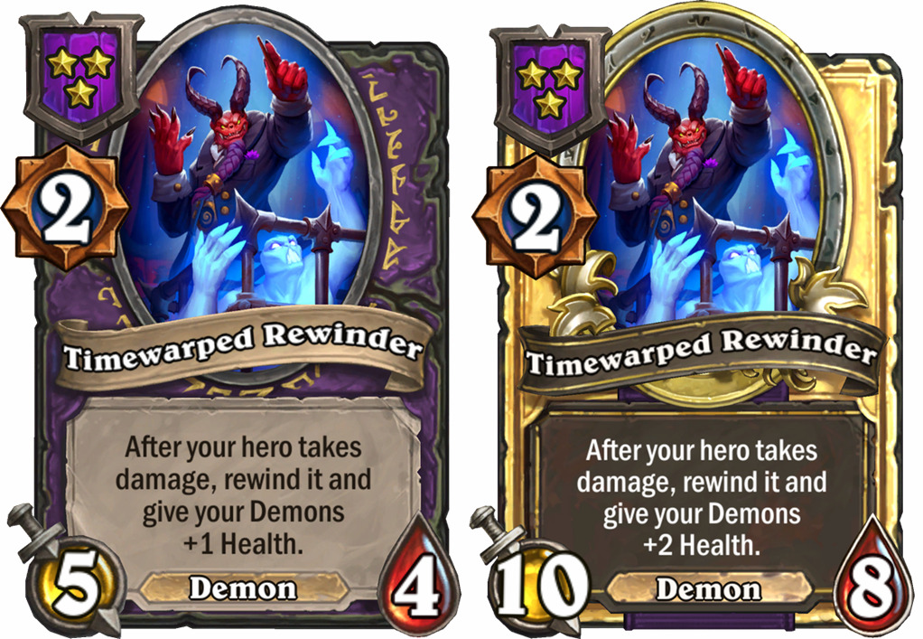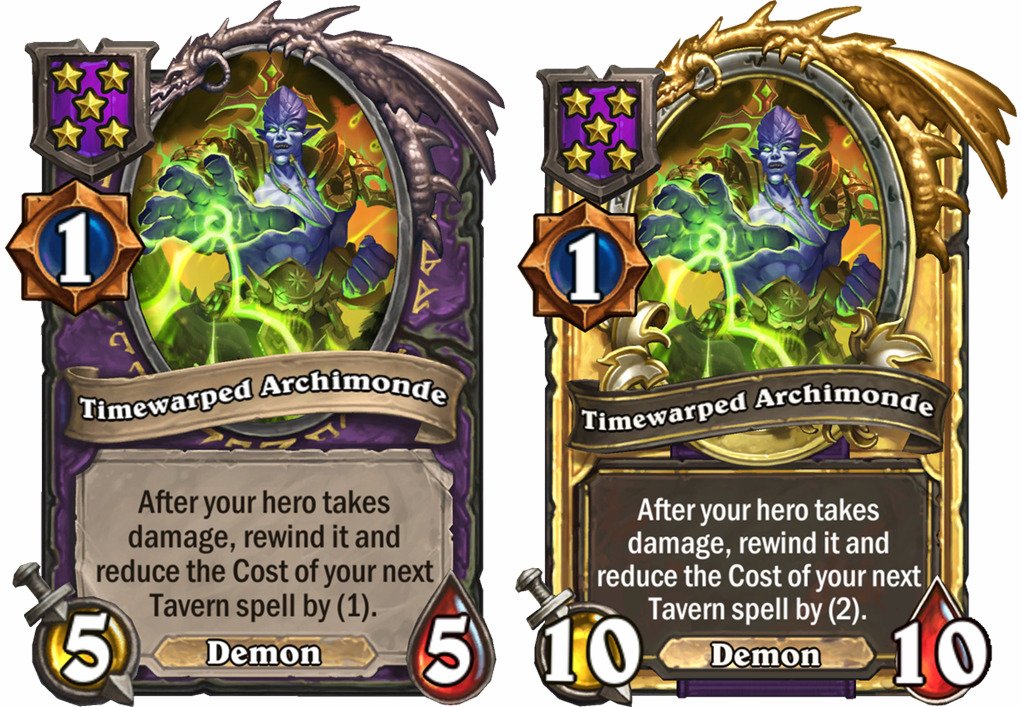 - [1费5/5恶魔] 在你的英雄受到伤害后,回溯该伤害并使你下一个酒馆法术消耗的铸币减少(1)点。