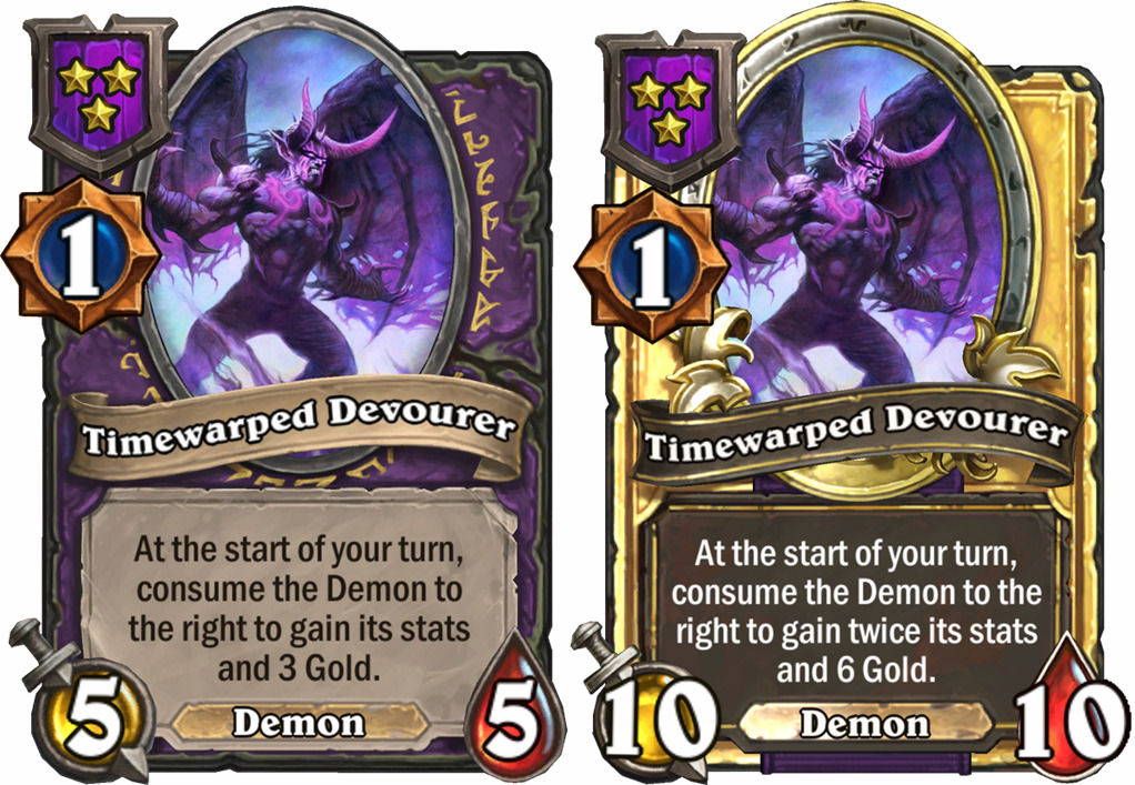 - [1费5/5恶魔] 在你的回合开始时,吞食本随从右边的恶魔以获得其属性值以及3枚铸币。