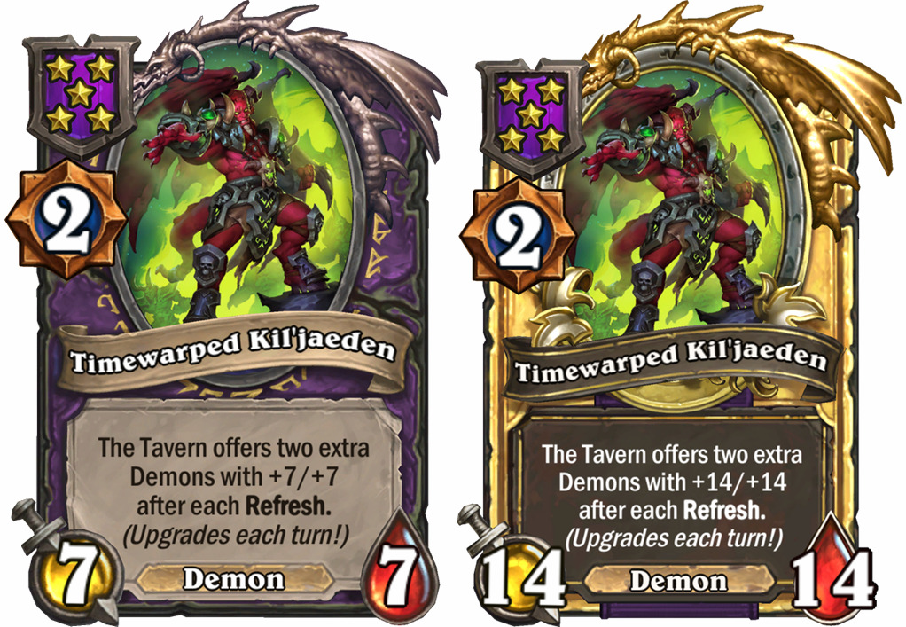 - [2费7/7恶魔] 在每次刷新后,酒馆额外提供两个具有+7/+7的恶魔。(每回合都会升级!)