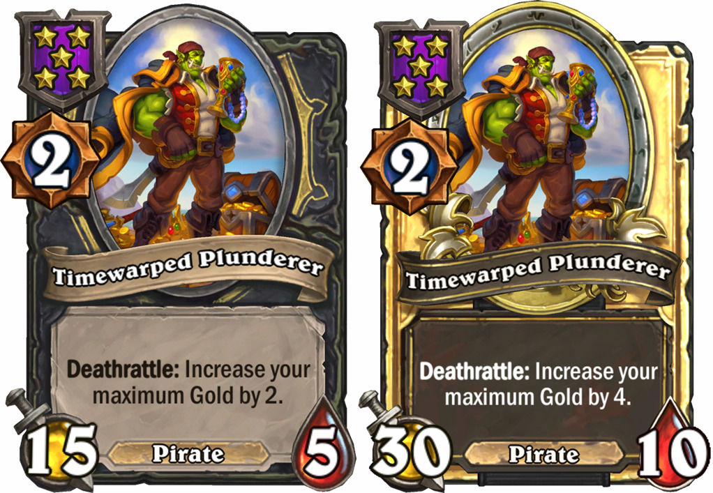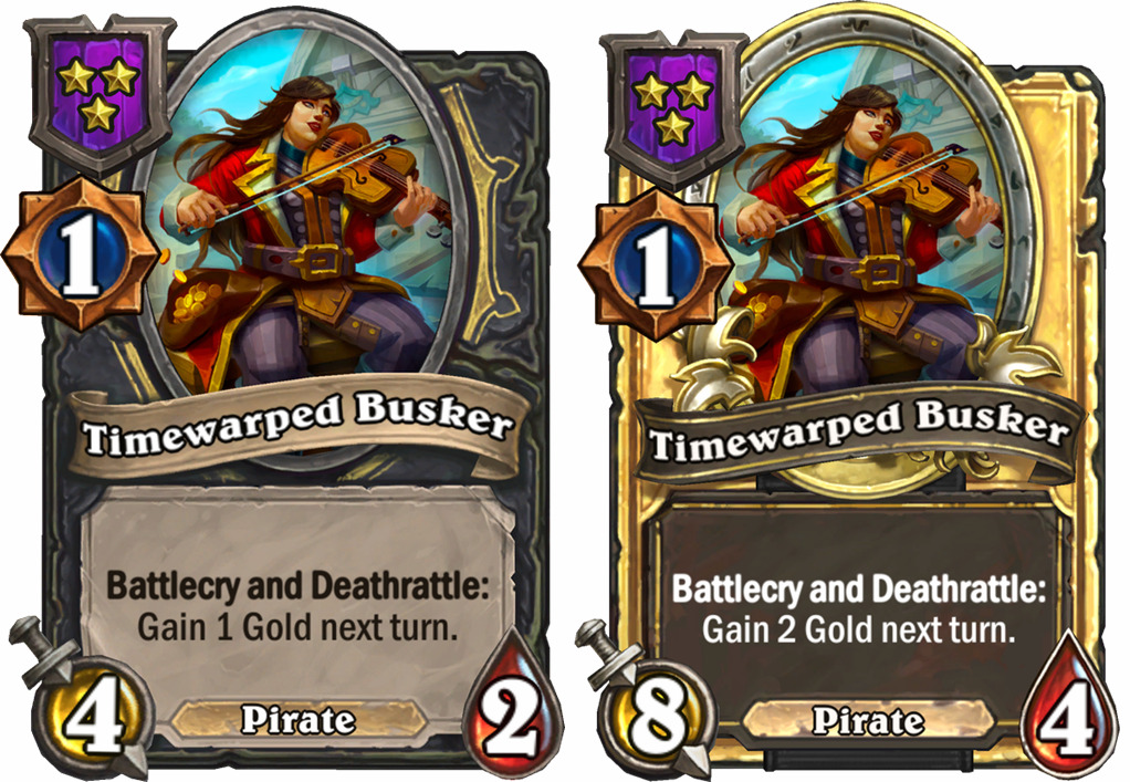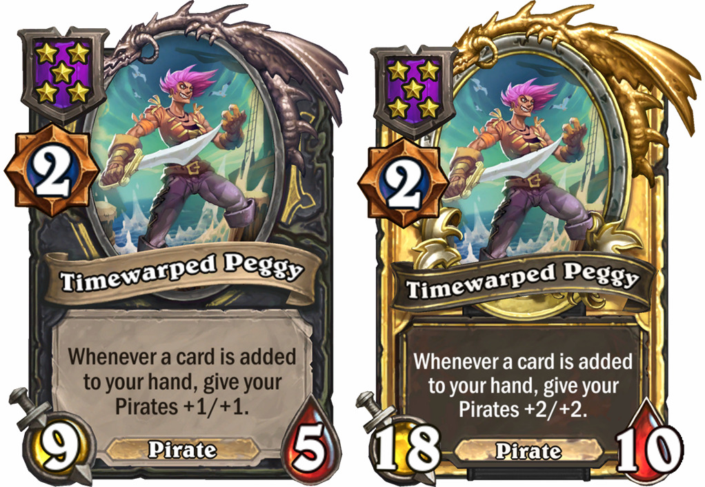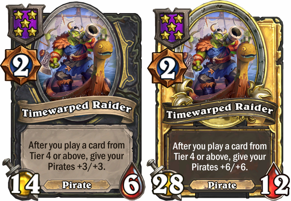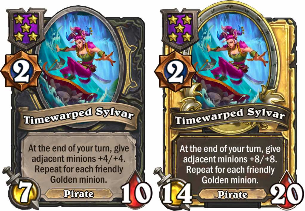 - [2费7/10海盗] 在你的回合结束时,使相邻的随从获得+4/+4。每有一个友方金色随从,重复一次。