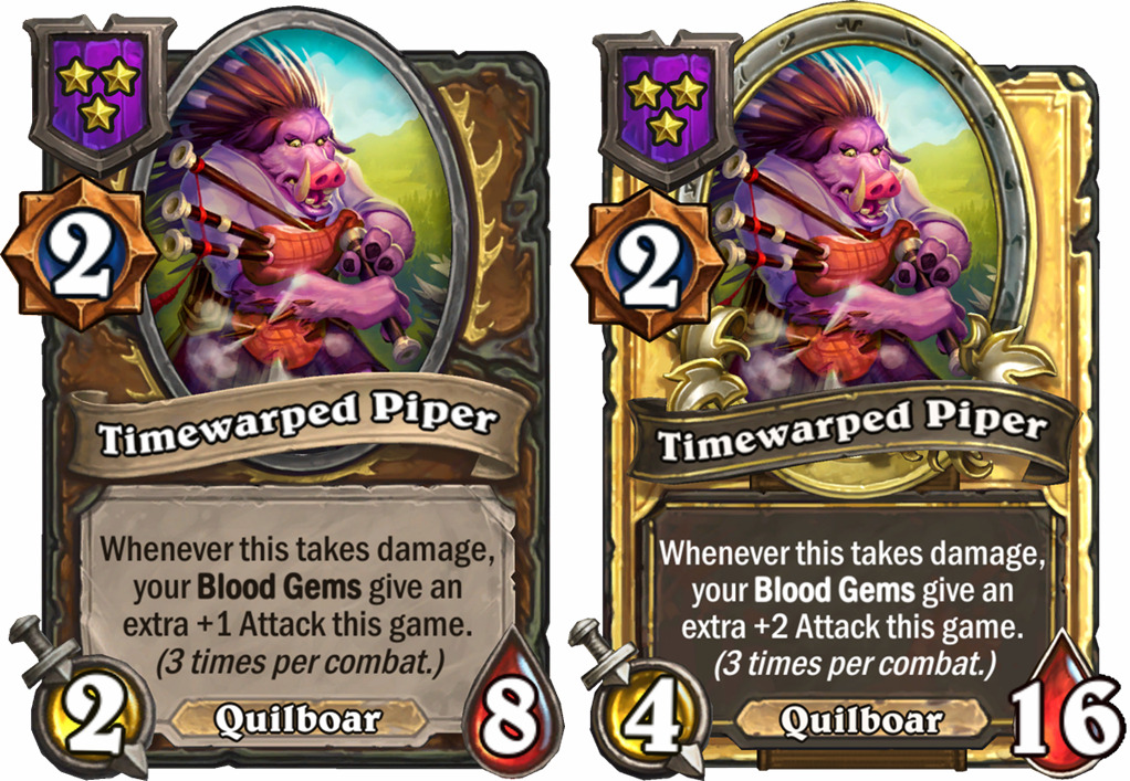 - [2费2/8野猪人] 每当本随从受到伤害,在本局对战中,你的鲜血宝石使随从额外获得+1攻击力。(每场战斗限3次。)