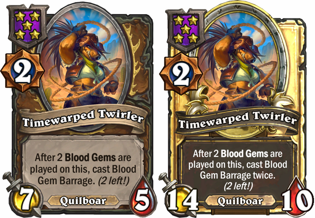 - [2费7/5野猪人] 在本随从被使用2张鲜血宝石后,施放鲜血宝石弹幕。(还剩2张!)