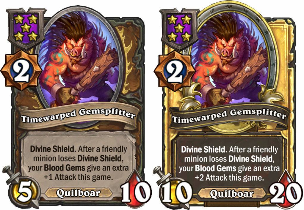 - [2费5/10野猪人] 圣盾。在一个友方随从失去圣盾后,你的鲜血宝石会在本局对战中使随从额外获得+1攻击力。