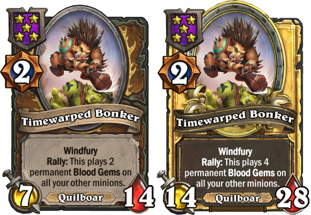- [2费7/14野猪人] 风怒。进击:本随从对你的所有其他随从各使用2张永久的鲜血宝石。