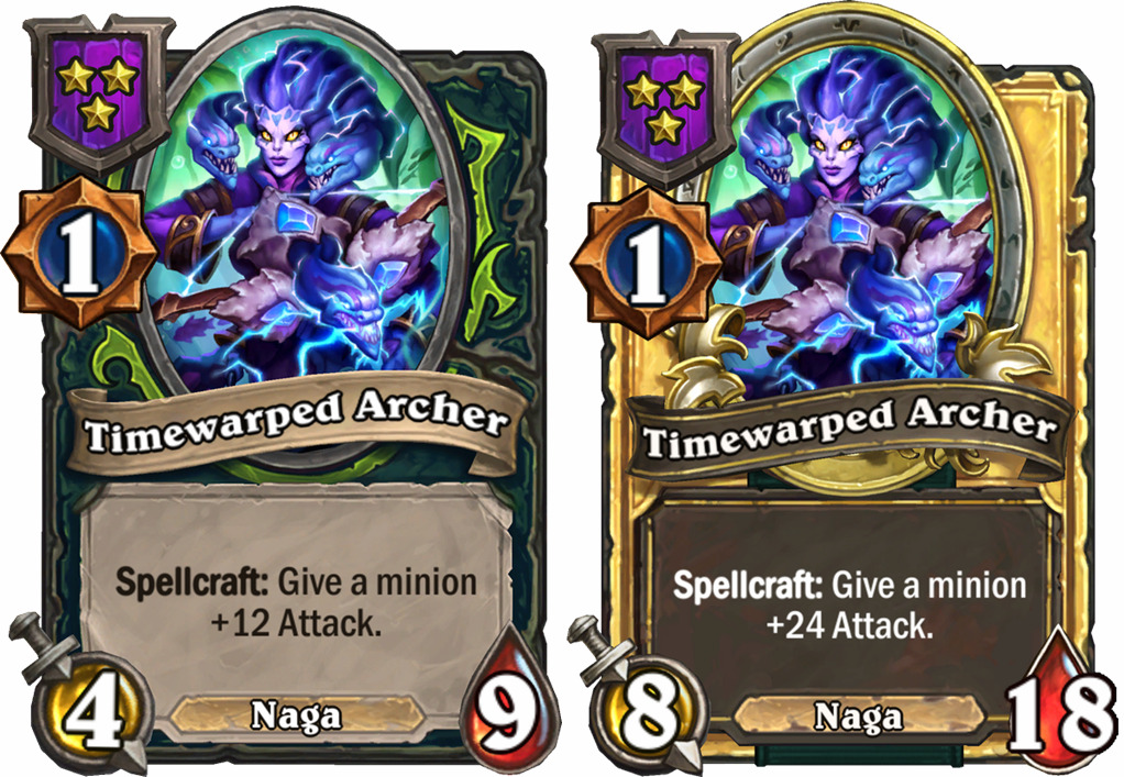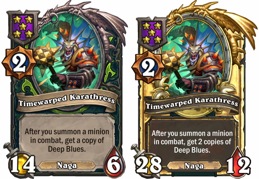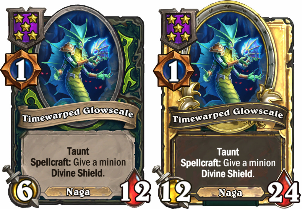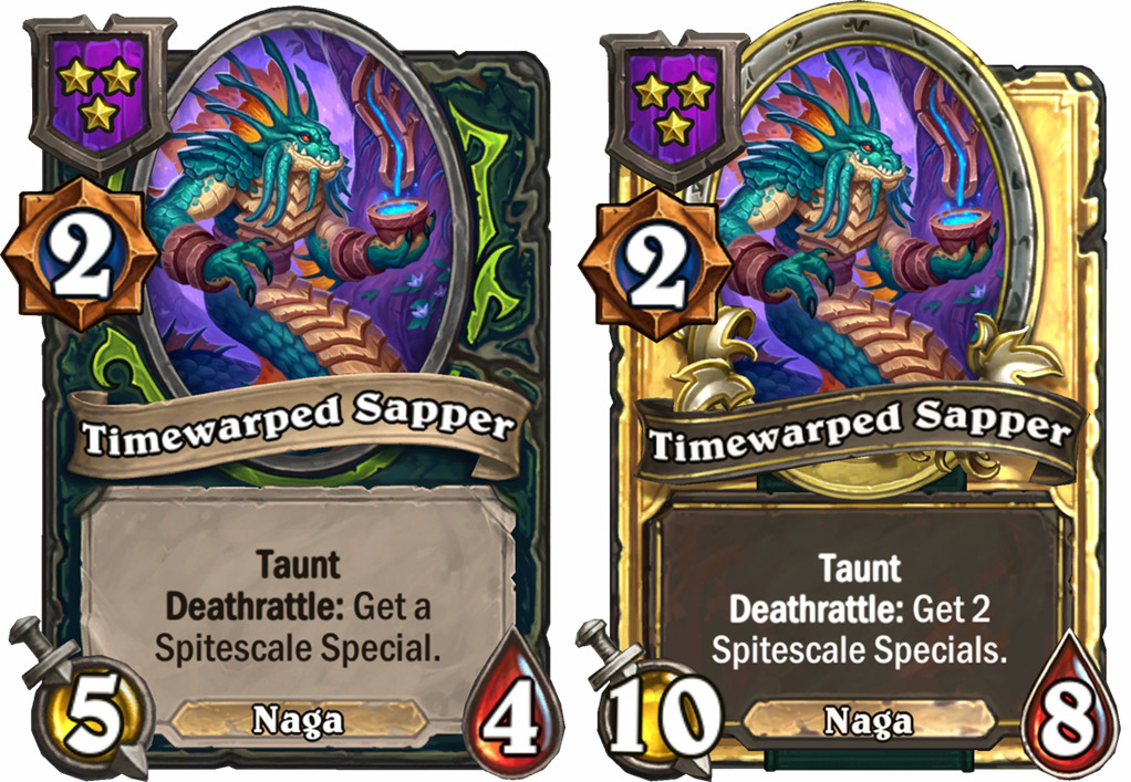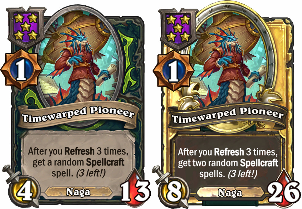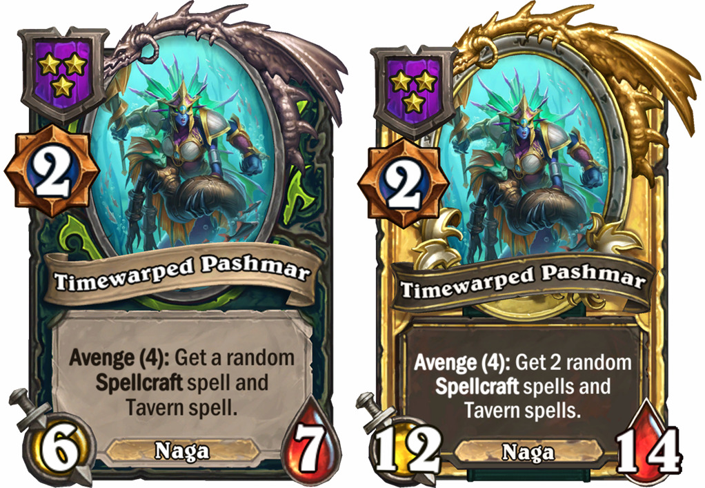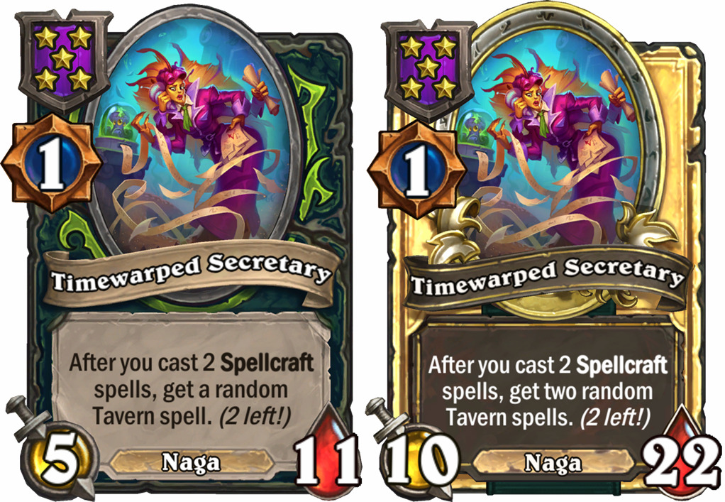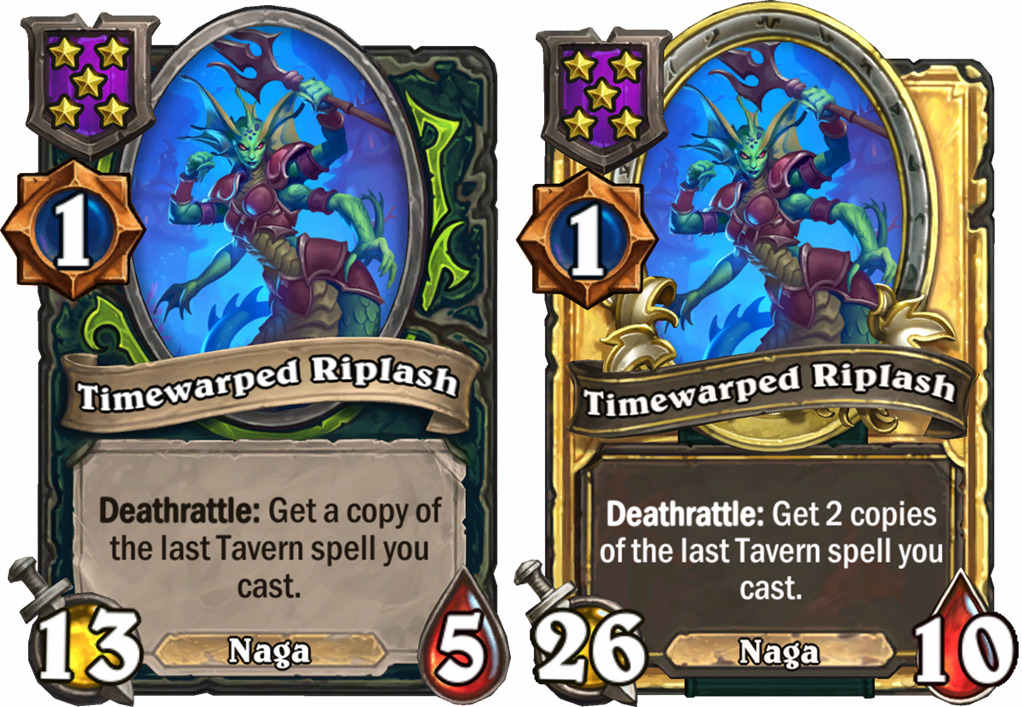 - [1费13/5纳迦] 亡语:获取你施放的上一个酒馆法术的一张复制。