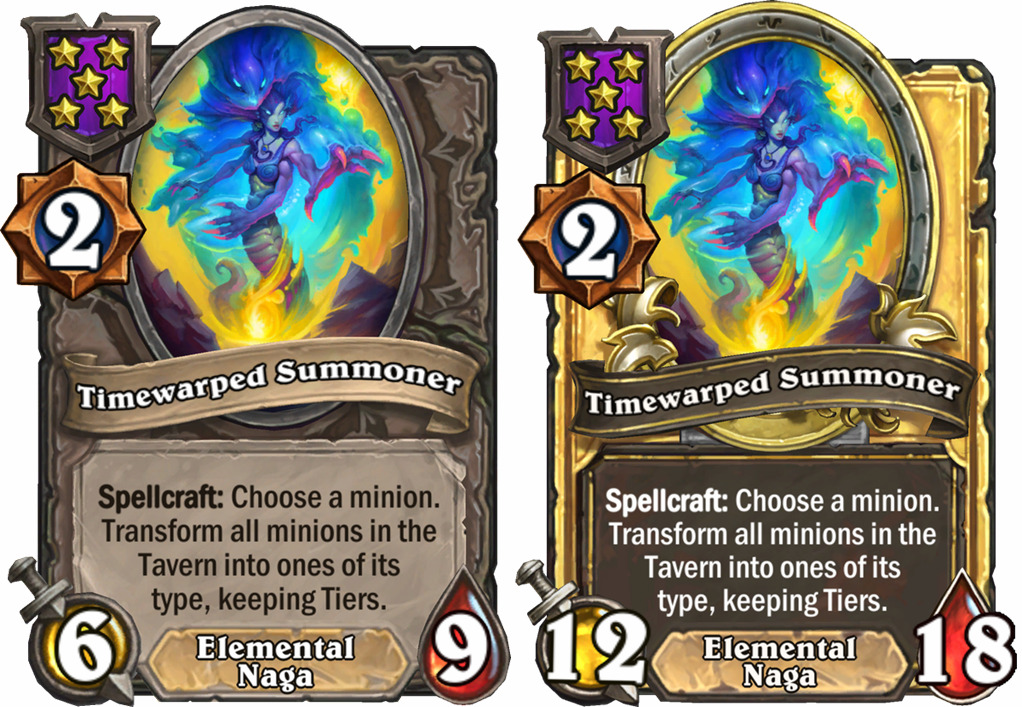 - [2费6/9元素+纳迦] 塑造法术:选择一个随从,将酒馆中的所有随从变形成为原有等级的所选类型的随从。