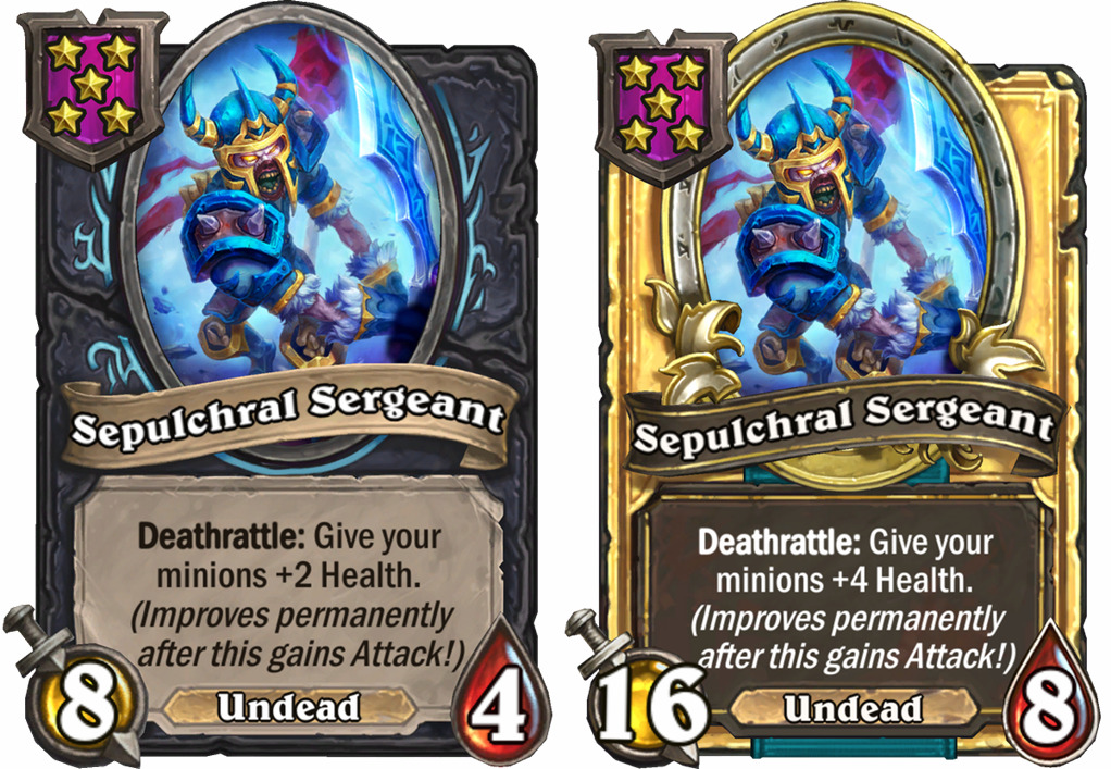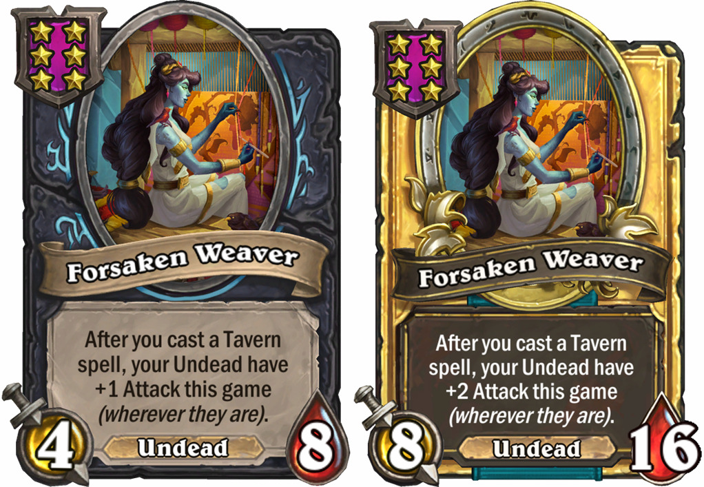- [6星4/8亡灵] 在你施放一个酒馆法术后,你的亡灵在本局对战中拥有+1攻击力(无论它们在哪)。