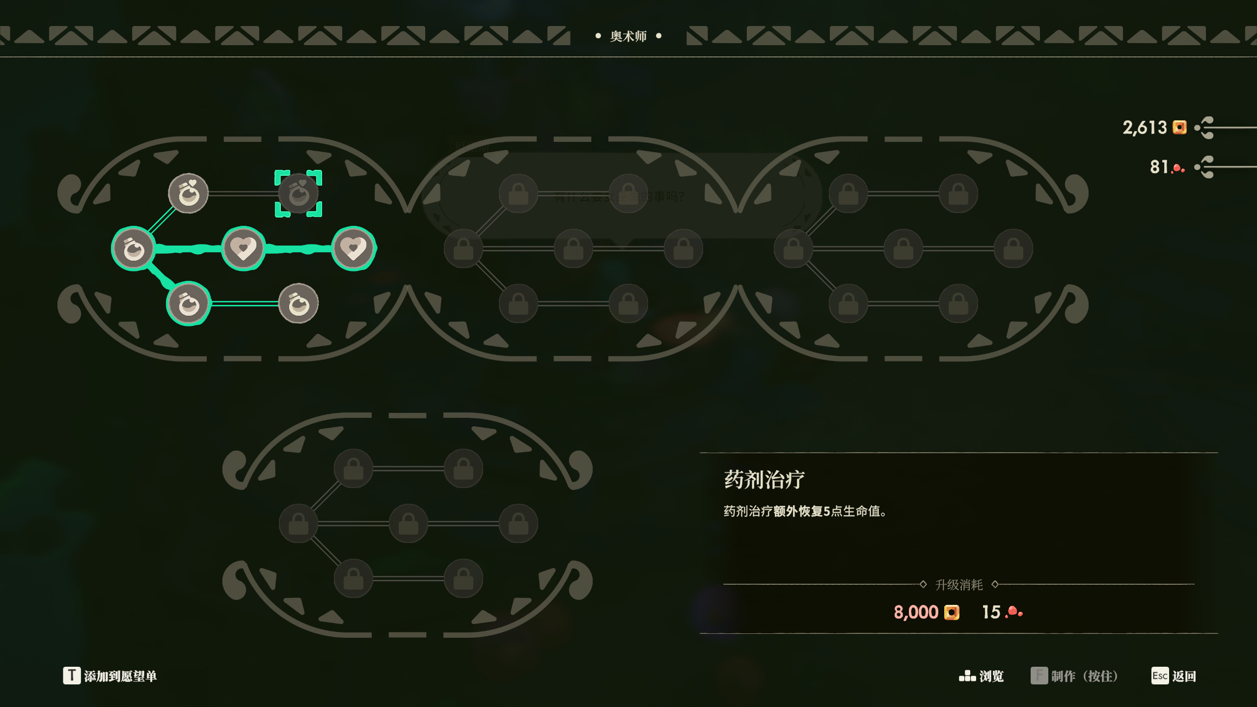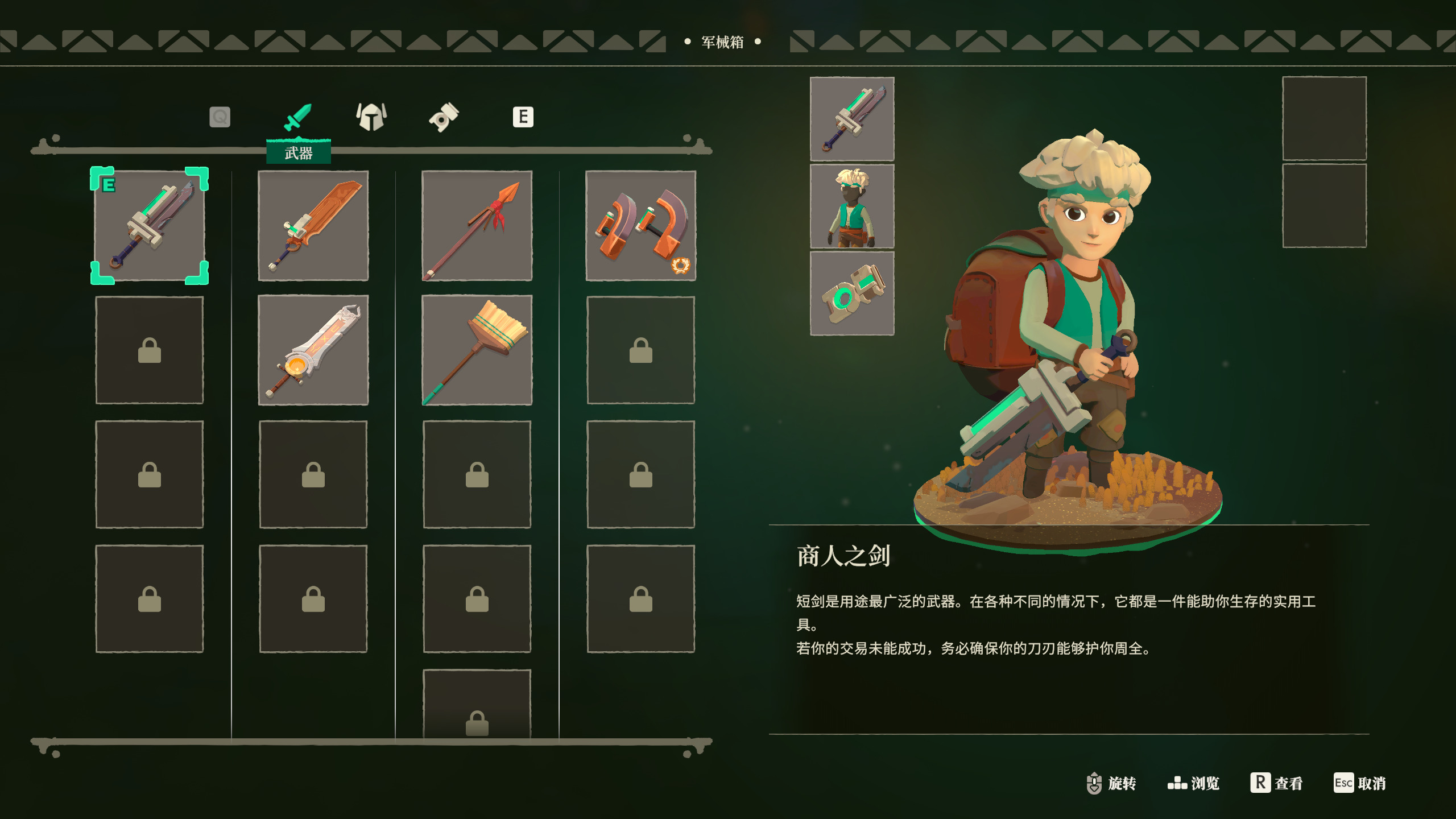 游戏中包含足量的局外成长,其中包括治疗药剂相关、武器相关、属性相关、装备相关。其中武器相关中需要我们通过推进关卡进入藏宝地获得配方或者打败boss拿到特殊材料以及根据任务来进行解锁,获得新武器的制造方法并制造。置于治疗药剂以及属性相关都与大多数肉鸽游戏类似,需要我们去刷取相当于的道具以及通过遗物卖出的金币来升级。此外还有背包容量的增长,不过这个消耗的金币过多,每开一个格子所需的金钱爆炸式增加,过于肝了。