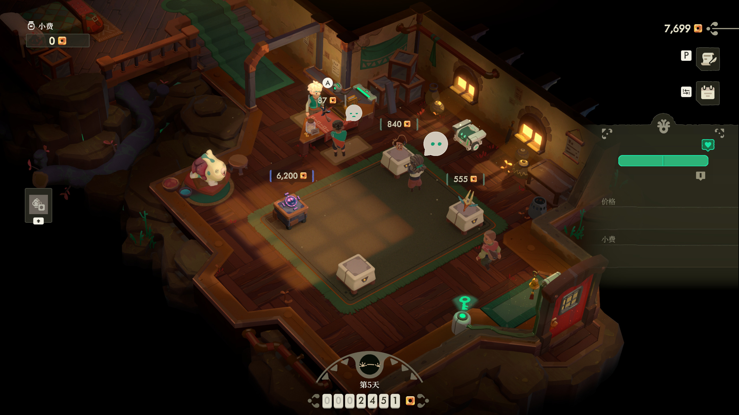 在游戏的经营部分,其实和前作玩法上只有些微差别。先说下地牢打到的遗物具体价值我们是看不到的,只能看到稀有度颜色以及下方的遗物附加价值,需要我们在上架的时候凭感觉定价,然后结合顾客看到价格的表情来做加减法。顾客一共有四种表情“见钱眼开、微笑、无语、生气”分别对应了“价格太便宜了、价格非常合适、价格略高但能接受以及价格太高了无法接受”四种状态。我们可以通过顾客表情判断价格是否过高从而开始做加减法。另外经营部分也有一些肉鸽元素,效果大概是增加售卖进度等等。
