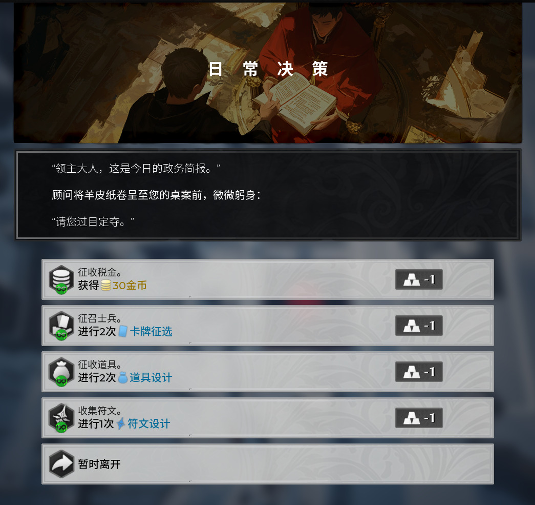 在城市阶段,玩家主要通过以下方式强化自己的卡组:在商店消耗金币购买卡牌,利用城市补给通过日常决策换取卡牌,或借助随机事件获取强力卡牌。除此之外,玩家还可以获得建筑、符文以及各类物品,这些都能在后续游戏中持续提升战力。同时,随机事件也承载着补充世界观的作用,让玩家在策略规划之余,逐步深入了解游戏背后的故事。