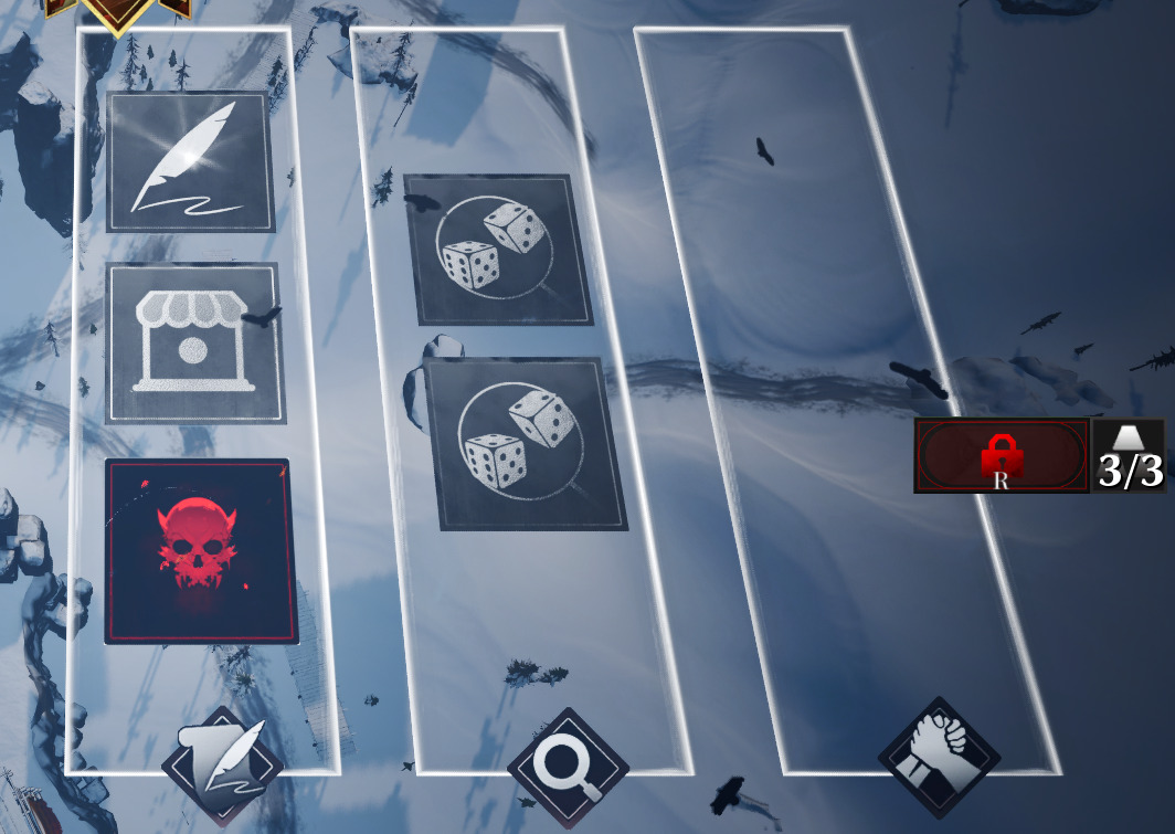《凛冬前线》的游戏流程主要分为城市阶段与战斗阶段。在城市阶段,玩家会获得一定的城市补给,可用于进行固定的日常决策、在商店中删除卡牌,或是触发随机事件中的选项。在挑战高难度时还有有额外的支援。战斗阶段则包含可选战斗与强制战斗:除Boss战外,其余战斗均为可选,玩家可以选择战斗以获取奖励,也可以跳过战斗、直接获得金币与城市补给。普通战斗失败仅会扣除1点城市完整度,而Boss战则无法跳过,一旦失败游戏即告结束。