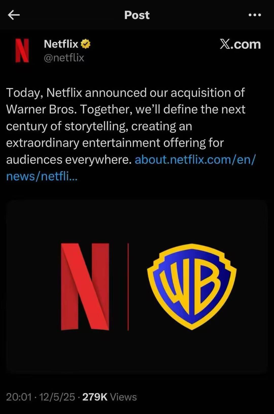 12月5日,全球流媒体巨头Netflix宣布与华纳兄弟探索公司达成最终收购协议,交易金额高达827亿美元。网飞表示,它们将共同定义下一个世纪的叙事方式,为全球观众打造非凡的娱乐体验。