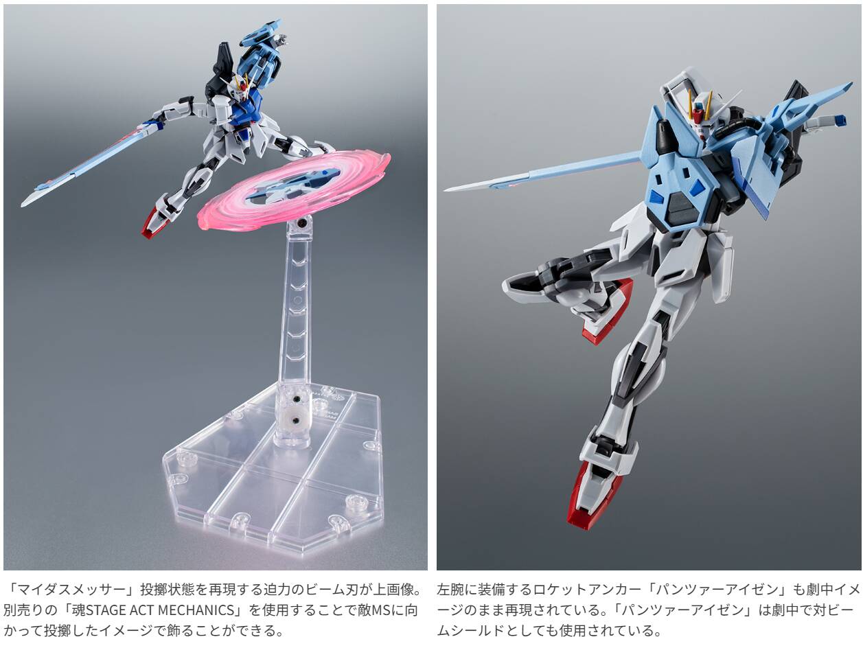 ストライクガンダムの近接戦闘用パック「ソードストライカー」は設定どおりストライクガンダムへの装着が可能!専用のディスプレイ台座と豊富なビームエフェクトが付属します。